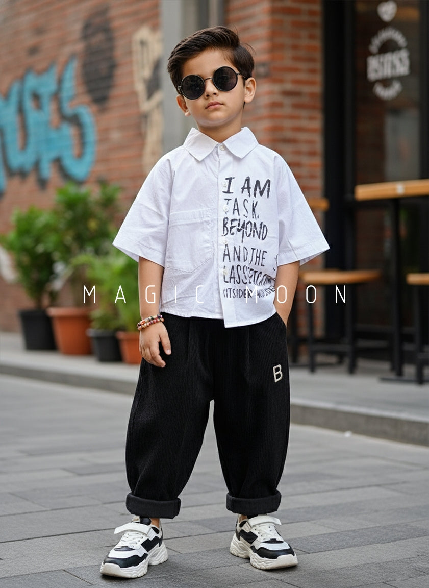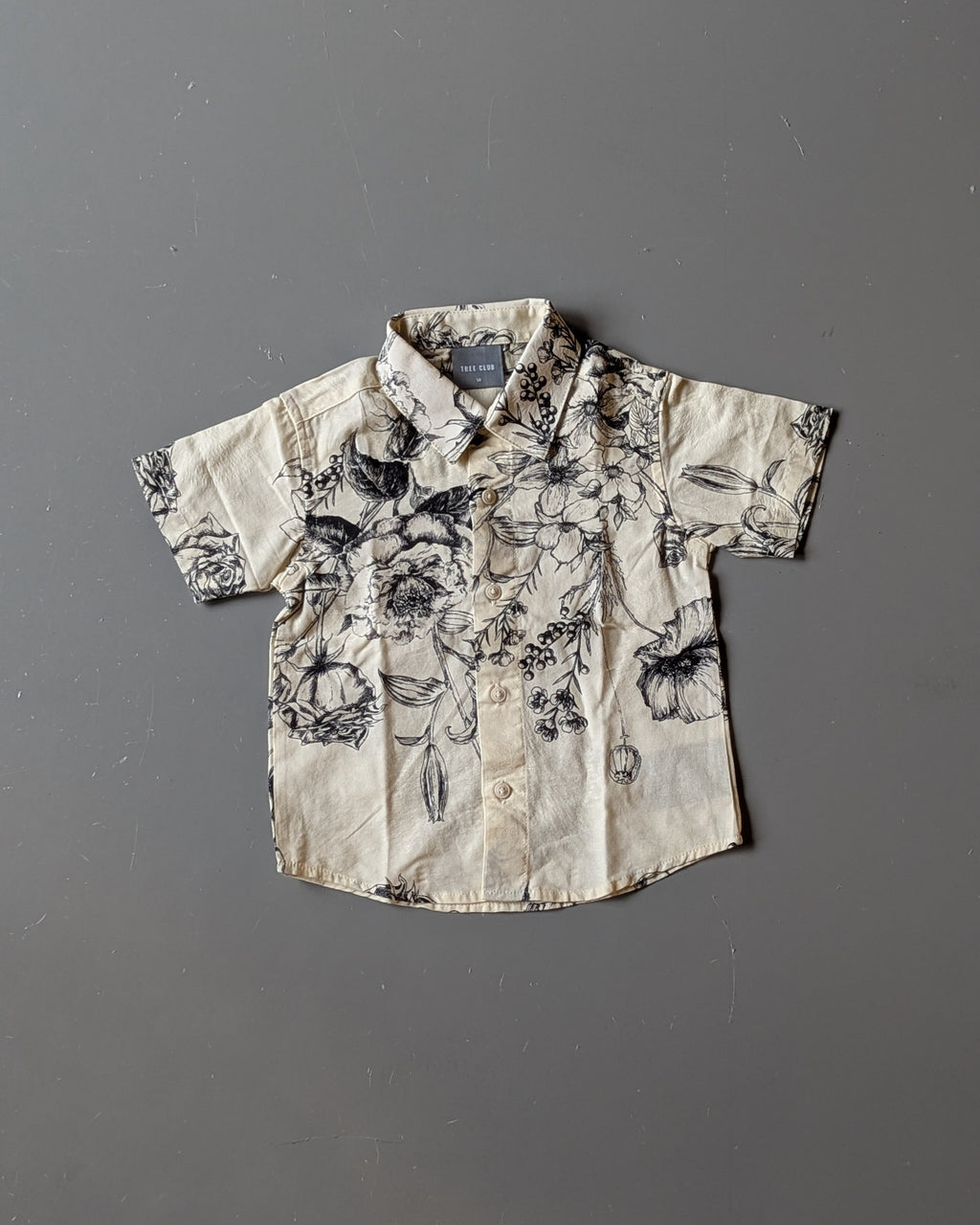Color/Pattern: The shirt has an off-white or cream-colored base with a detailed, black floral and botanical print. The print style is reminiscent of a sketch or line dr...