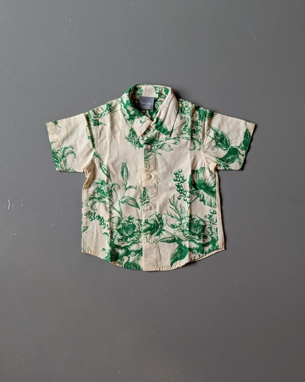 Color/Pattern: The shirt has an off-white or cream-colored base with a detailed, green floral and botanical print. The print style is reminiscent of a sketch or line dr...