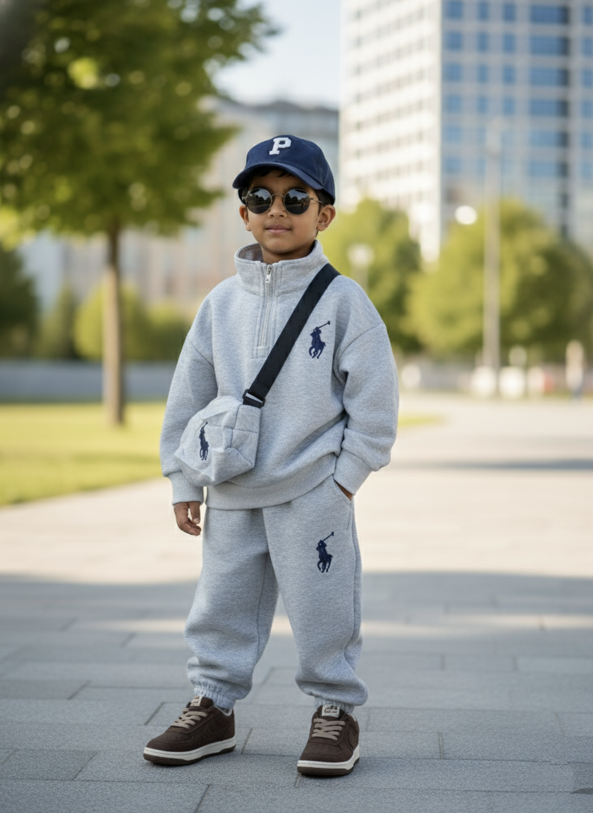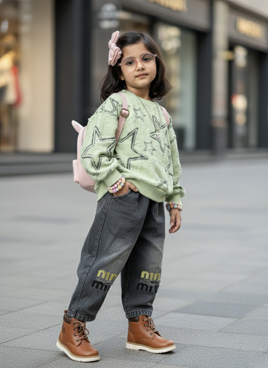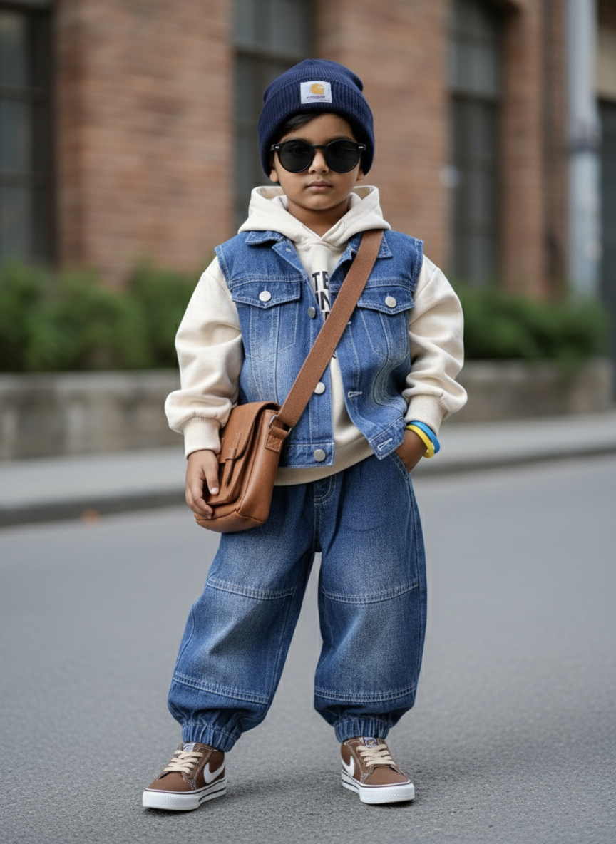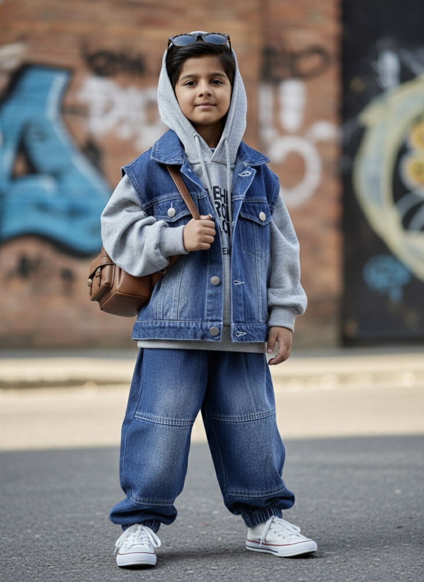 The set embodies a casual, high-fashion streetwear aesthetic for kids, with a focus on texture and print.