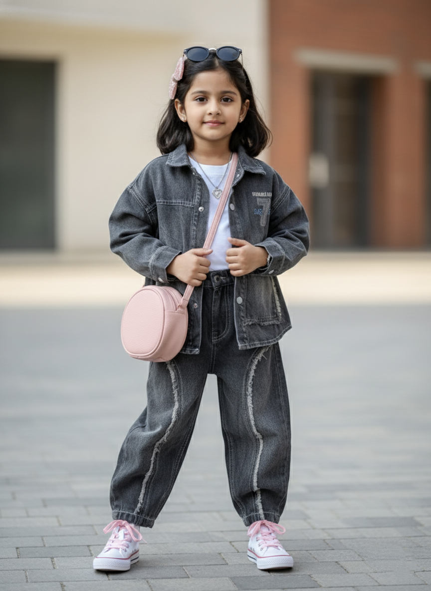 This is a stylish, coordinated two-piece set for a child, featuring a distinct dark grey/acid-wash denim or denim-look fabric. The ensemble is presented on a mannequin torso and legs, suggesting it's likely ...