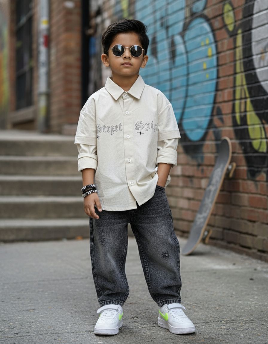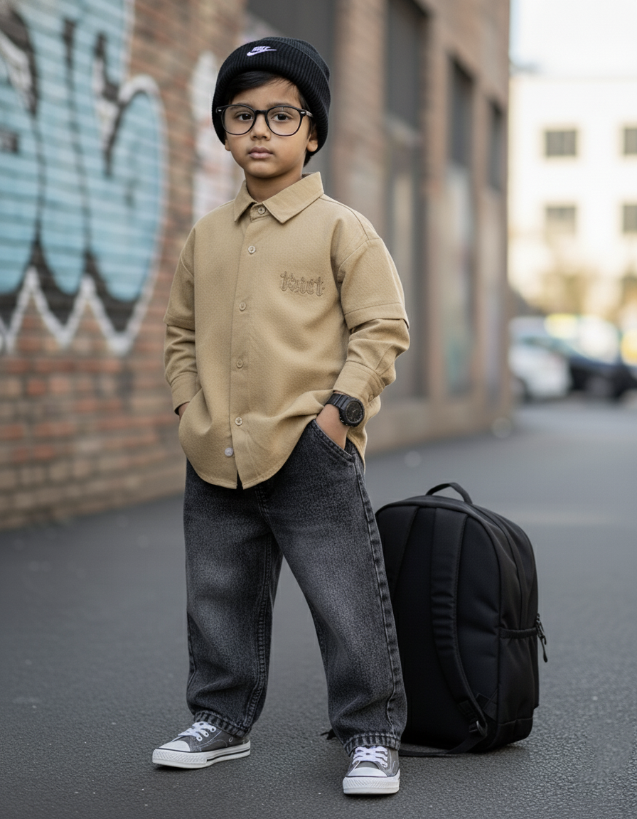 Color and Fabric: It's a beige shirt, appearing to be made from a solid, perhaps somewhat textured or brushed, fabric.