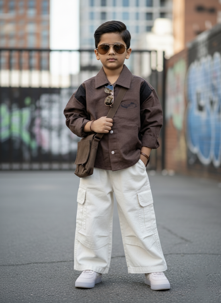Color and Fabric: It's a dark brown shirt, appearing to be made from a solid, perhaps somewhat textured or brushed, fabric.