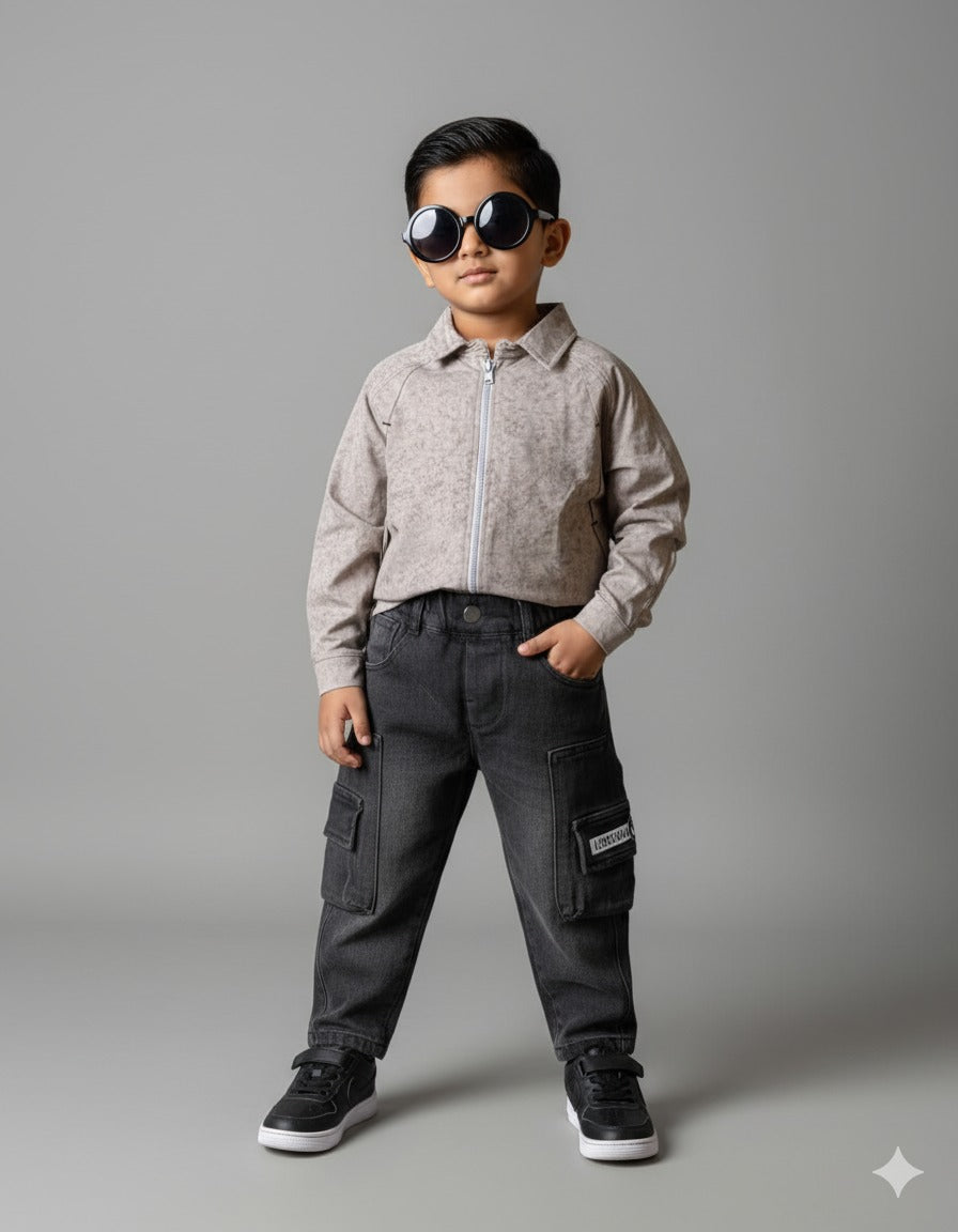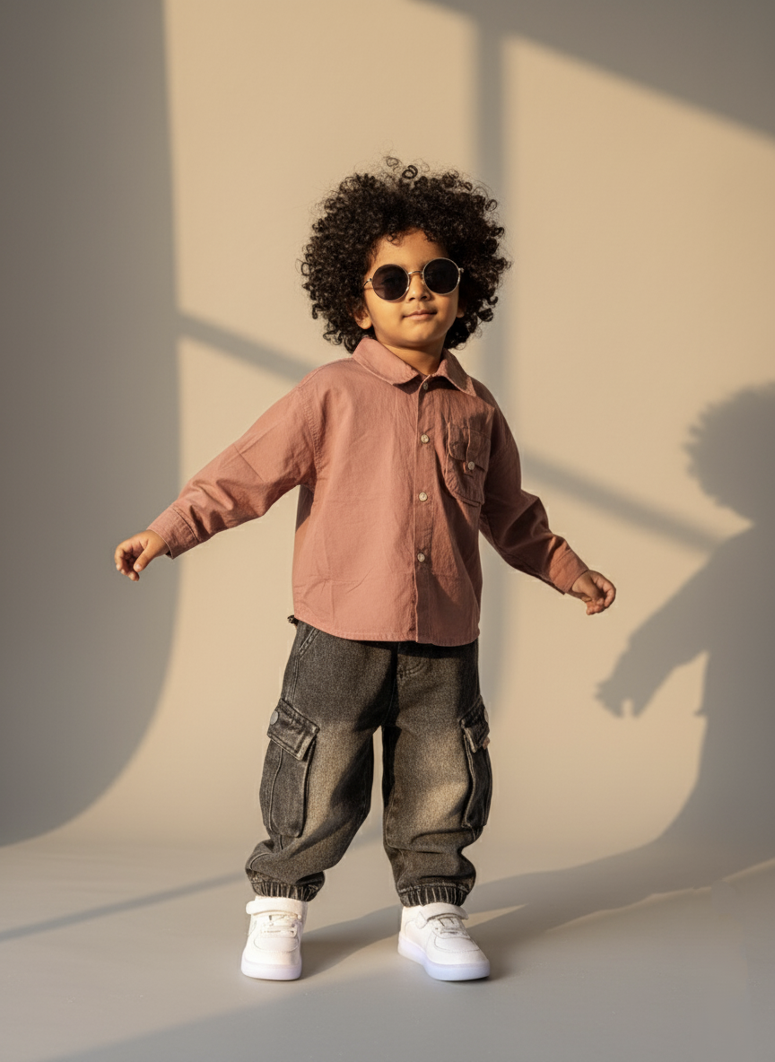 Color and Fabric: It's a dark shirt, appearing to be made from a solid, perhaps somewhat textured or brushed, fabric.