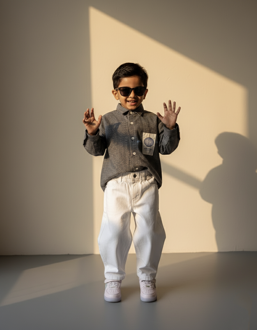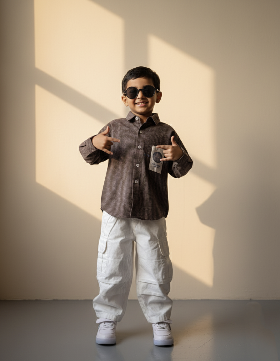 Pattern: The shirt has a very fine plaid or gingham pattern, made of light-colored lines on a dark background.