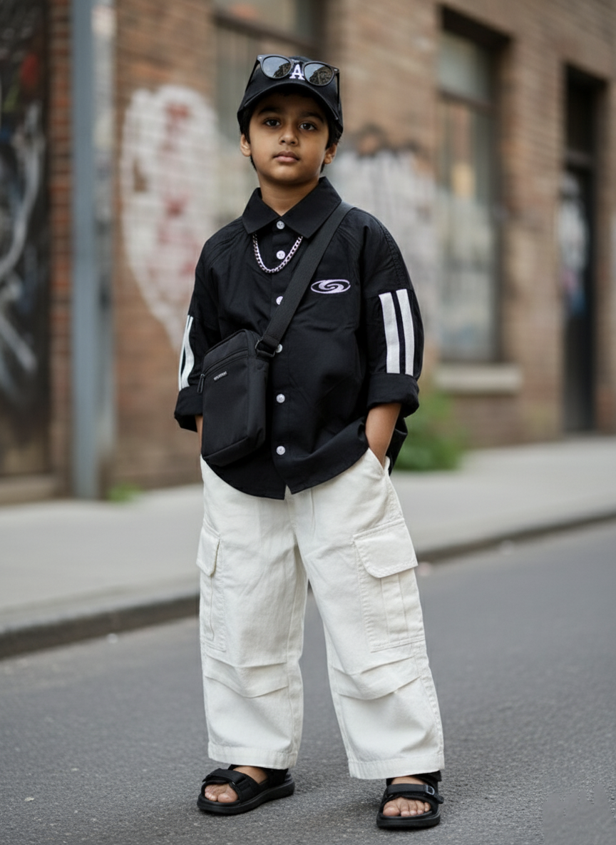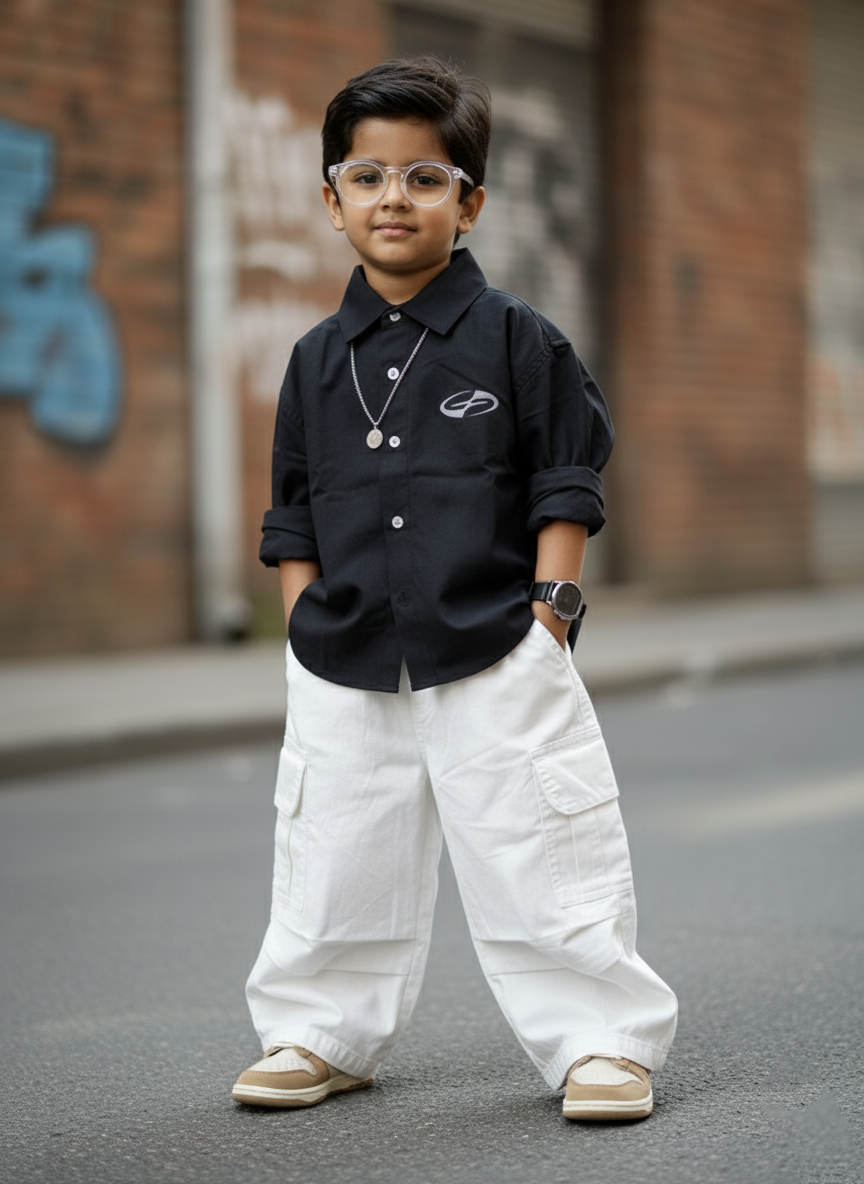 Color and Fabric: It's a black shirt, appearing to be made from a solid, perhaps somewhat textured or brushed, fabric.