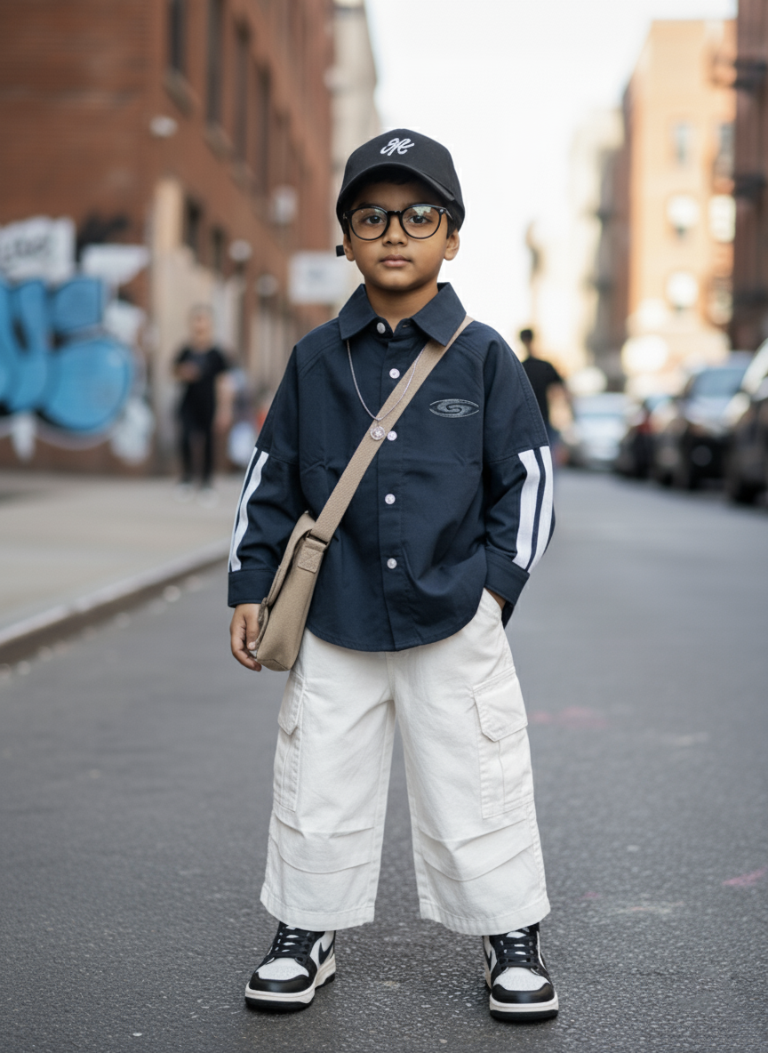 Color and Fabric: It's a dark blue shirt, appearing to be made from a solid, perhaps somewhat textured or brushed, fabric.