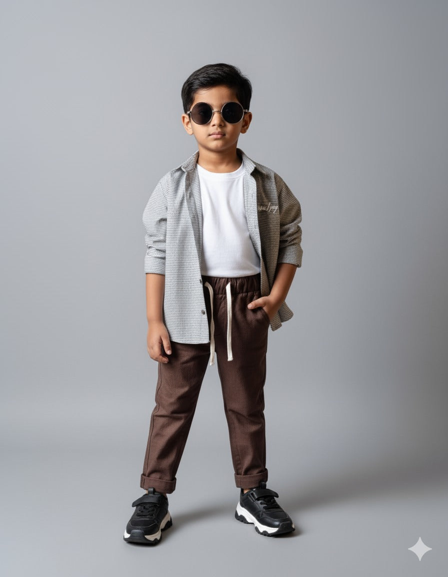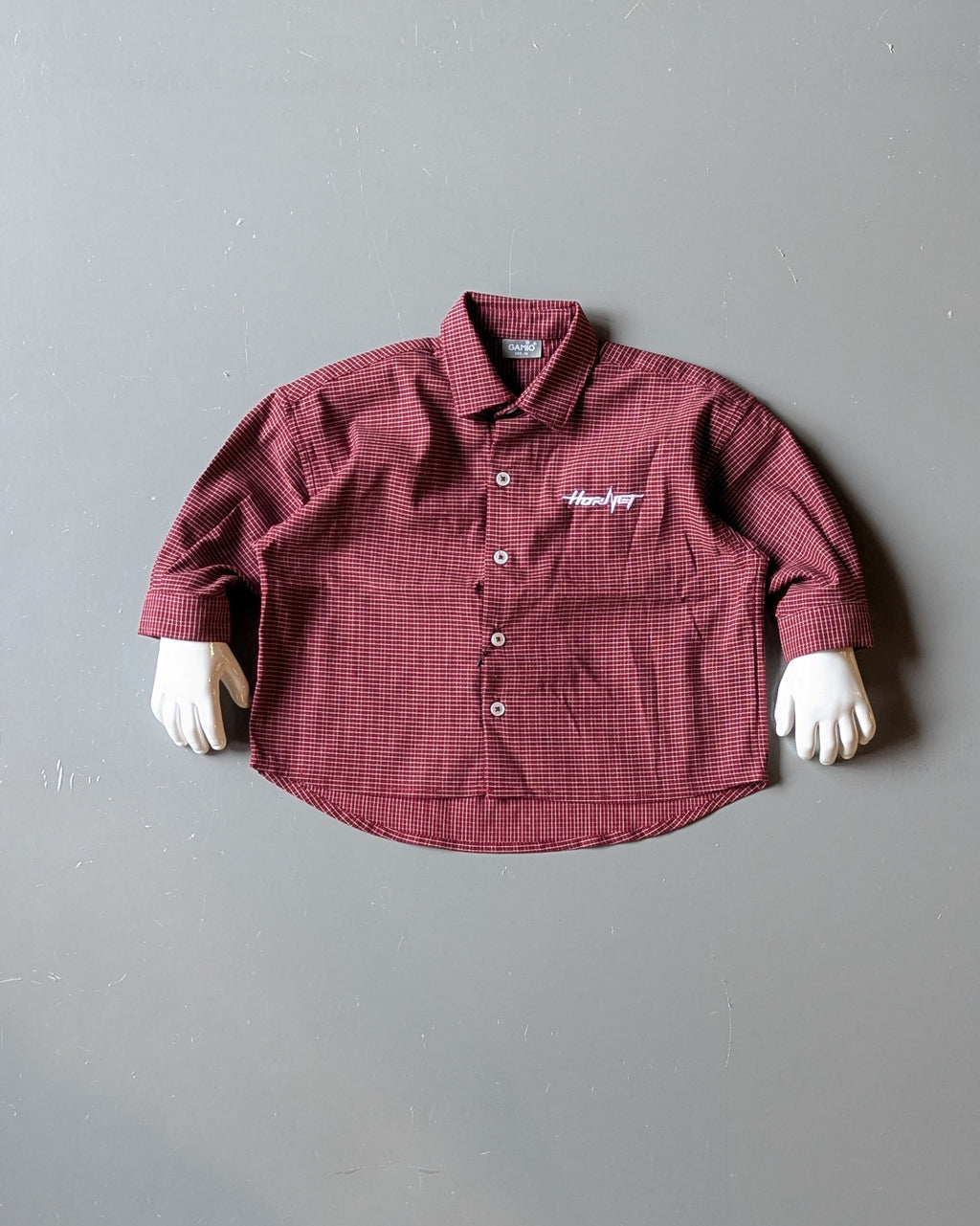 Pattern: The shirt has a fine plaid or gingham pattern, made up of light-colored, thin lines on a slightly darker background, creating a small checkered effect.