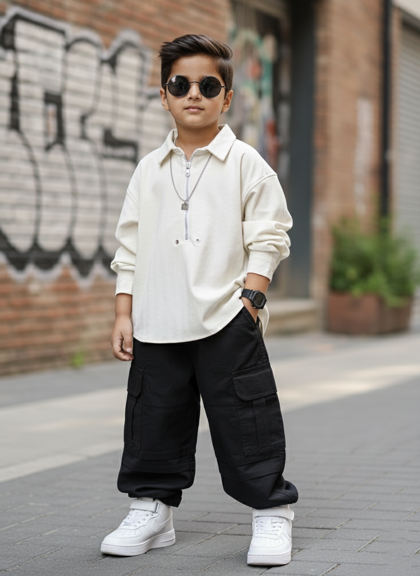 Fabric: The fabric has a vertical striped texture, possibly a corduroy or a textured pique knit, with the stripes being subtle and tone-on-ton...