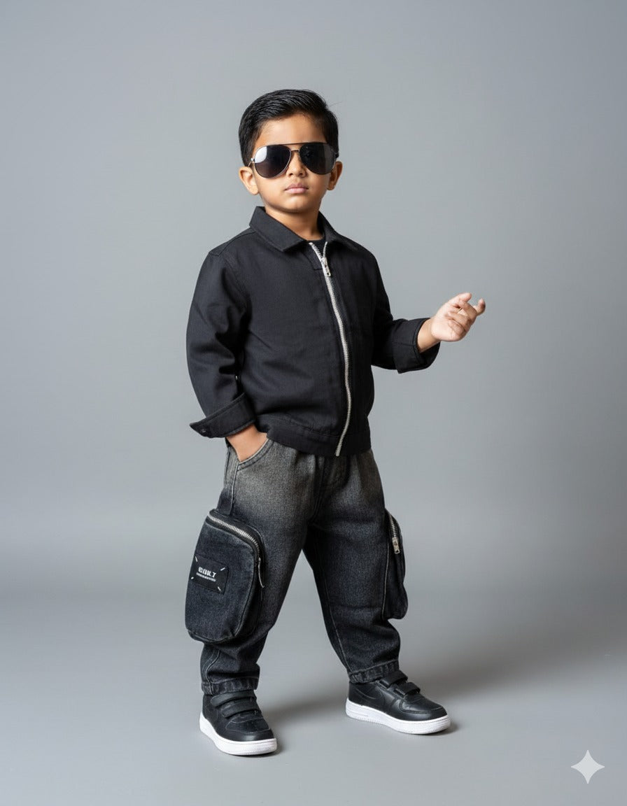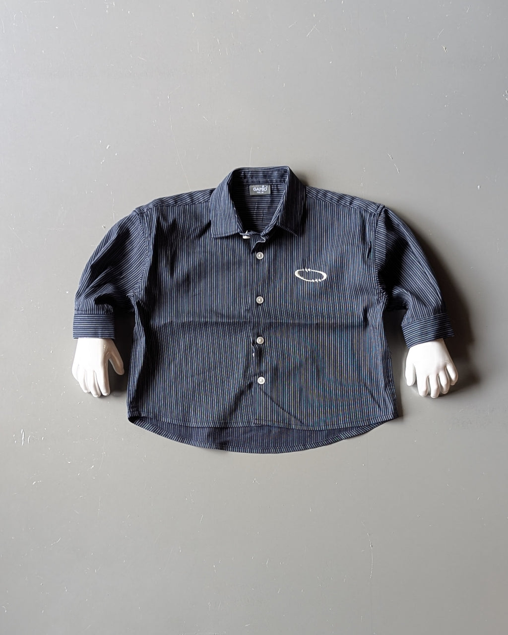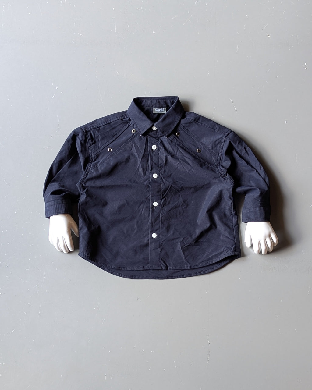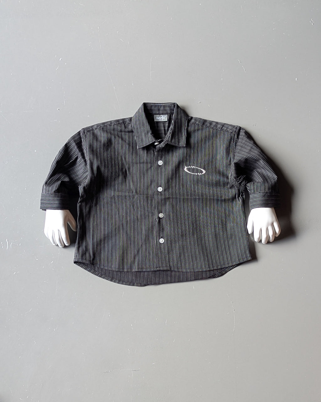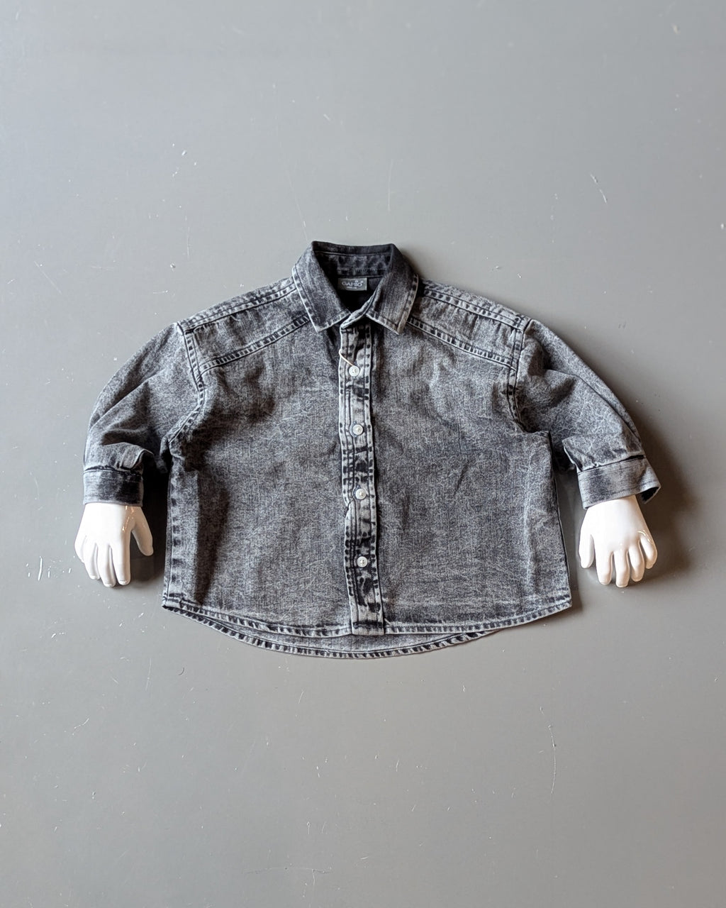 child's black denim shirt with a "stone washed" or faded effect. The shirt has long sleeves and a collar. It is fastened with several white buttons down the front. The fabric has visible seams along the shoulders and down the f...