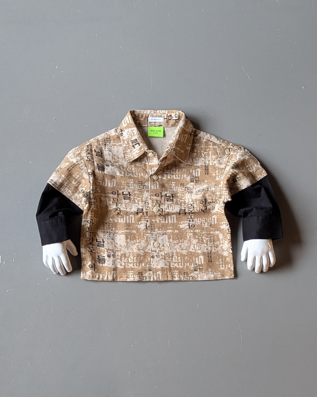 Color & Pattern: The body of the shirt is beige with an abstract, distressed brown pattern. Overlaid on this pattern are repeated black Korean Hangul...