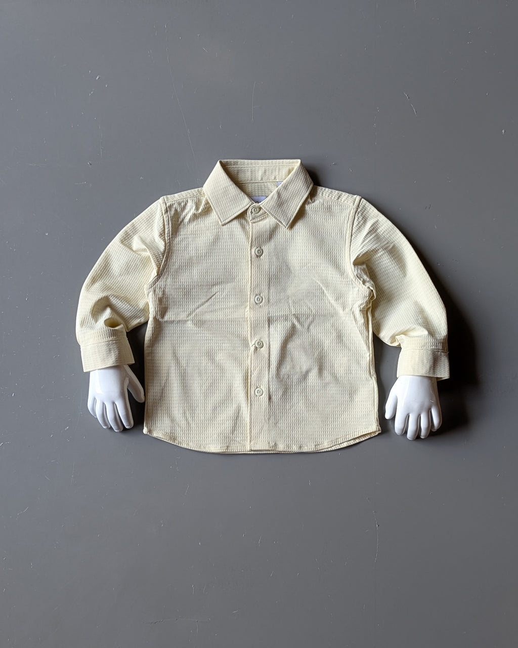 Color and Pattern: The shirt is a light, pale yellow color. The fabric has a subtle, textured pattern, appearing to be a small, woven check or a tiny grid pattern, which gives it a more detailed and interesting surface than a...