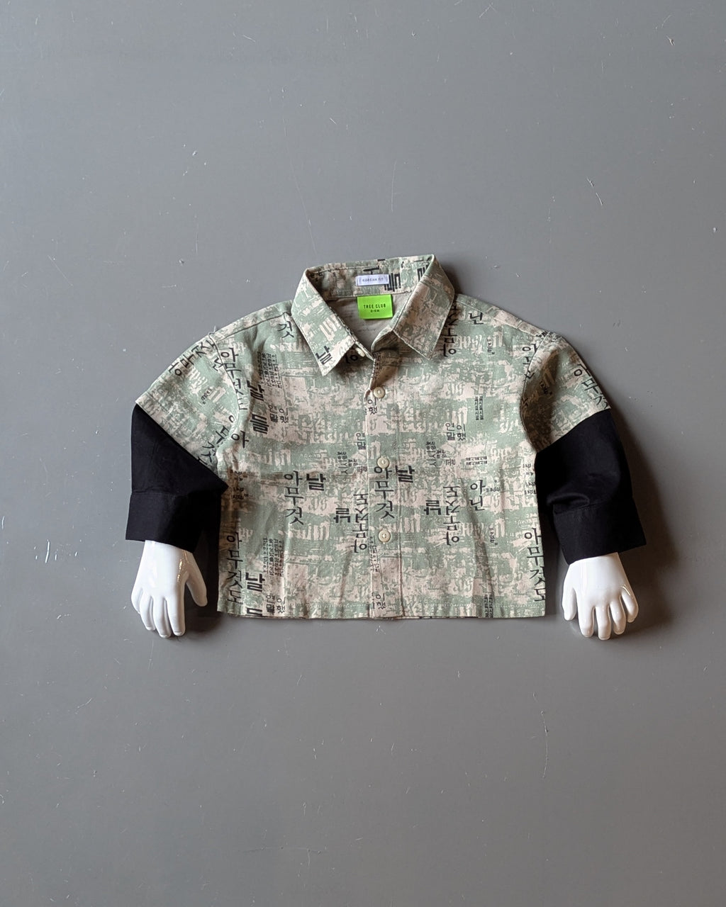 Color & Pattern: The body of the shirt features a complex, layered pattern. The base appears to be a muted, light green or olive camouflage-...