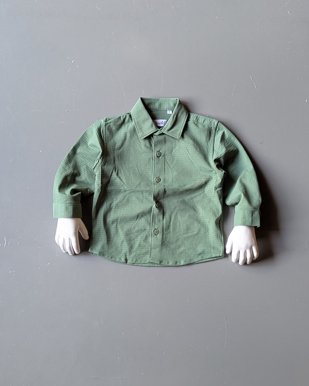 Color and Fabric: The shirt is a muted sage green color. The fabric has a visible texture, which appears to be a small, woven check or a fine corduroy, giving it a subtle pattern.