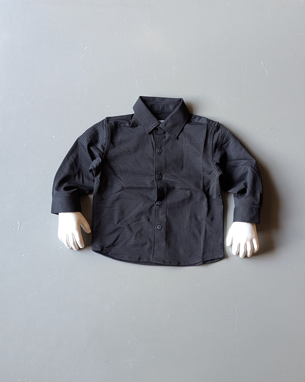 Color and Pattern: The shirt is a dark color, appearing to be black or a very dark gray. It features a subtle, woven pattern, possibly a small check or a textured stripe that is visible upon close inspection.