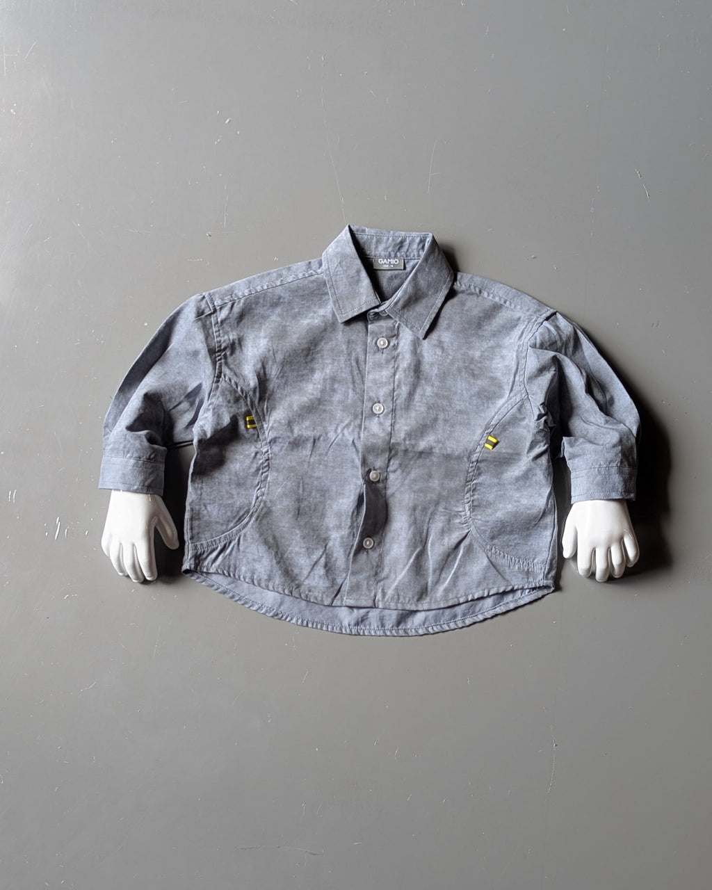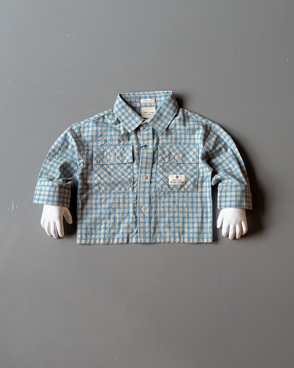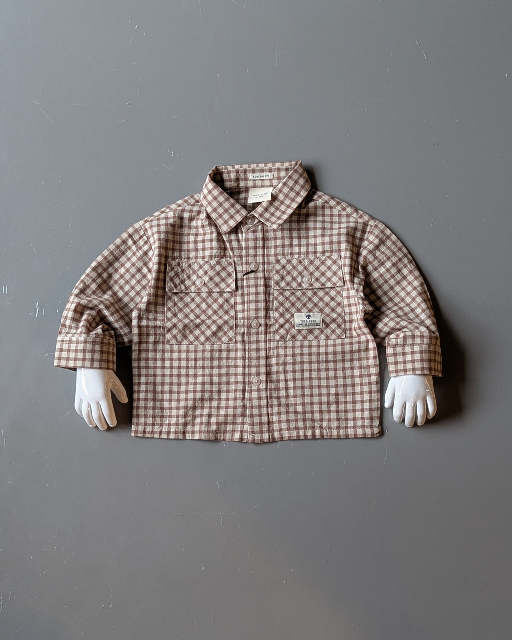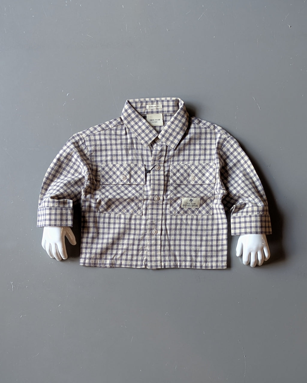 Garment Type: The item is a child's shirt, likely a flannel or a heavy cotton shirt, designed in the style of an overshirt or a shacket (shirt-jacket).