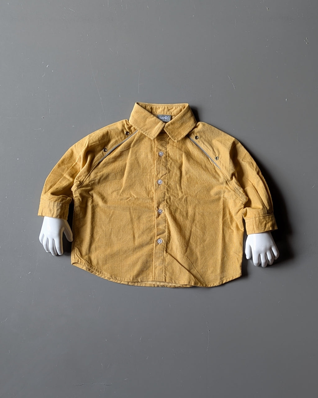 Color and Fabric: The shirt is a bright mustard or golden yellow color. The fabric has a very distinct vertical ribbed texture, indicating it is likely corduroy.