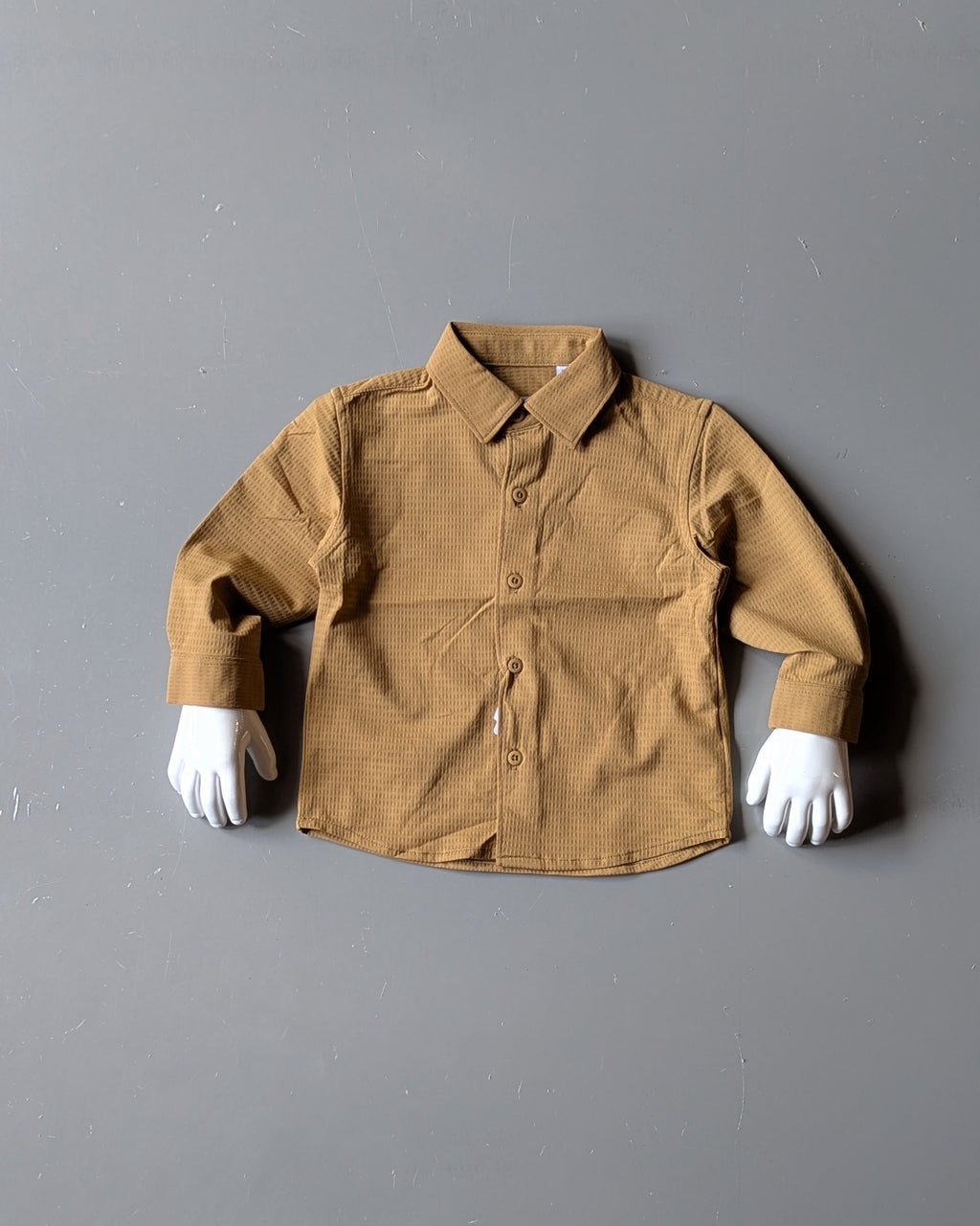 Color and Fabric: The shirt is a warm, earthy brown or tan color. The fabric has a distinct texture, appearing to be a corduroy or a similar ribbed material, with vertical lines or cords running down the shirt.
