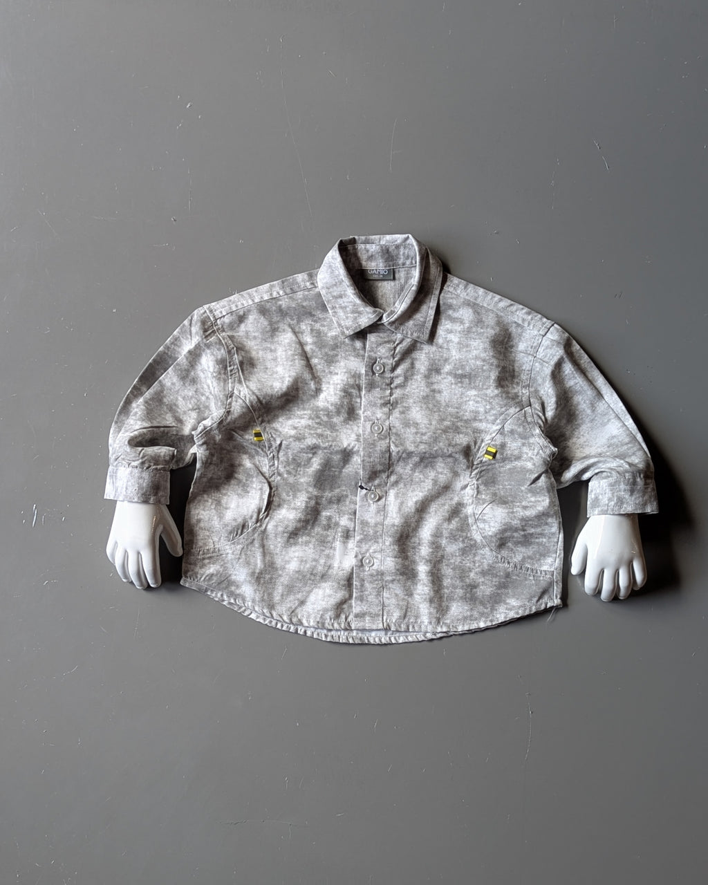 Pattern: The shirt has a unique, mottled, or faded camouflage-like print in tones of gray and beige, giving it a textural, worn-in look.