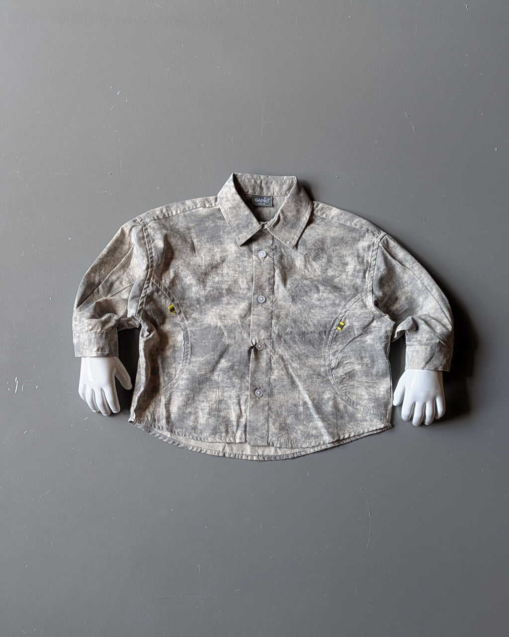 Color and Fabric: The shirt is a light to medium gray with a subtle, distressed, or mottled texture, giving it a slightly worn or casual look. The fabric appears to be woven.