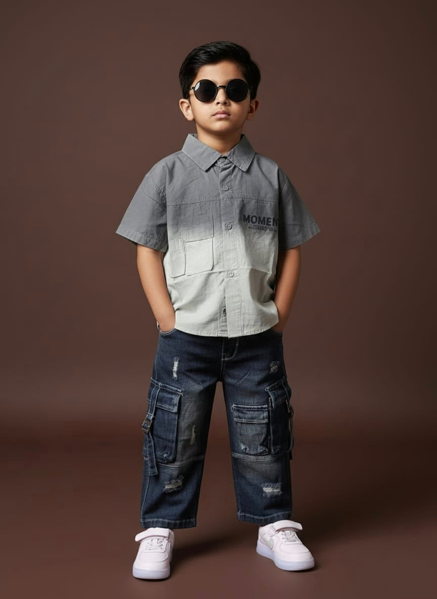 This is a children's short-sleeved, collared shirt. It features a vertical stripe pattern on the upper portion, which transitions into a solid, darker color (likely olive green or brown) towards the bottom in an ombre or dip-dy...