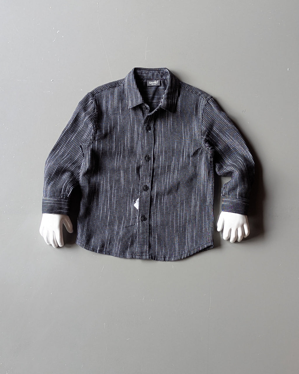 The shirt is primarily dark blue or charcoal grey and features subtle vertical stripes in a lighter color, possibly white or light grey, giving it a textured and refined appearance. It has a classic shirt collar and a full butt...