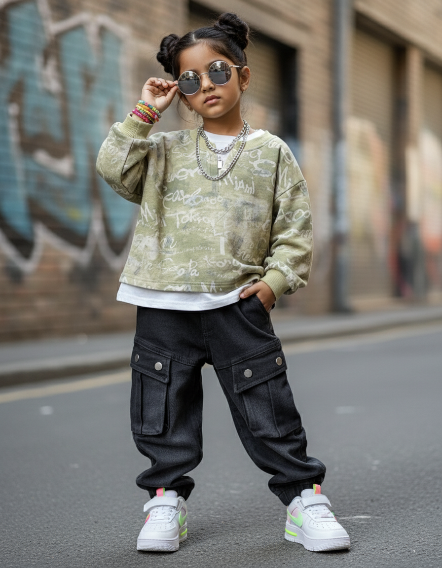 Color and Pattern: The main body of the sweatshirt is a gray tie-dye or distressed print, with what appears to be white or lighter gray script/handwriting printed all over the fabric. The overall look is a mix of textures and...