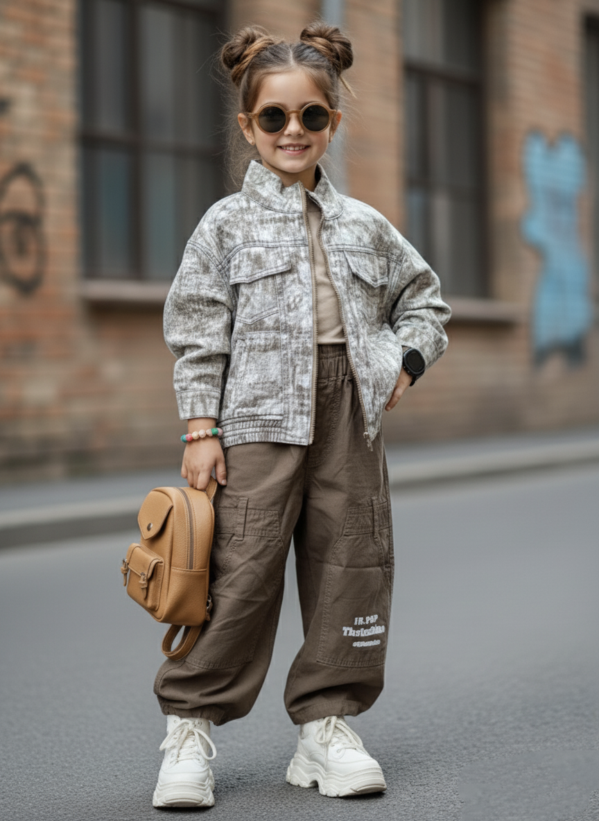 Style: It's a zip-up jacket with a collar, resembling a modernized denim or utility jacket cut.