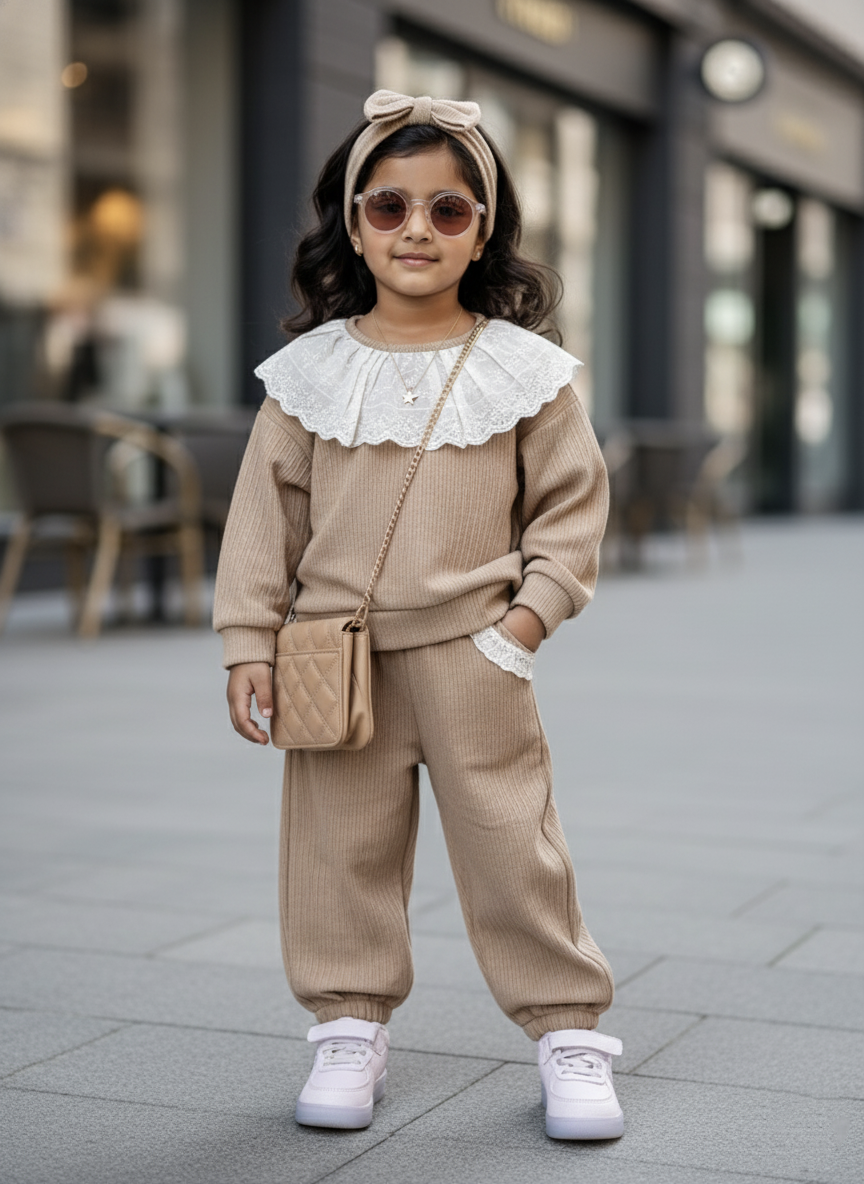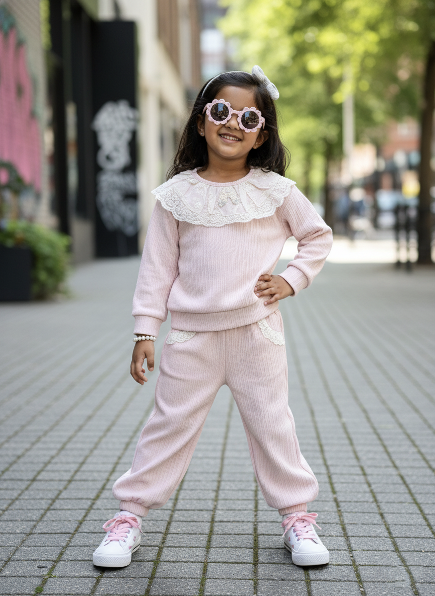 This is a two-piece casual set for a toddler or young child, likely a girl, featuring a cozy, textured fabric and delicate lace accents. The overall style is sweet, vintage-inspired, and comfortable.