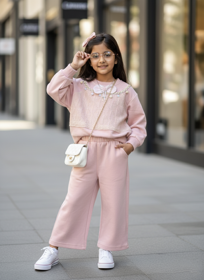 Color and Fabric: The main body of the top is a soft, solid light pink (or blush pink) color. It looks like a standard sweatshirt material (perhaps a cotton or cotton-blend fleece or French terry) ...
