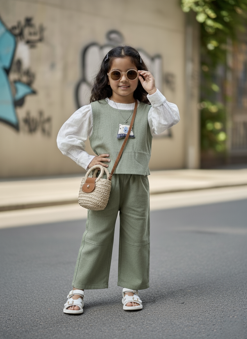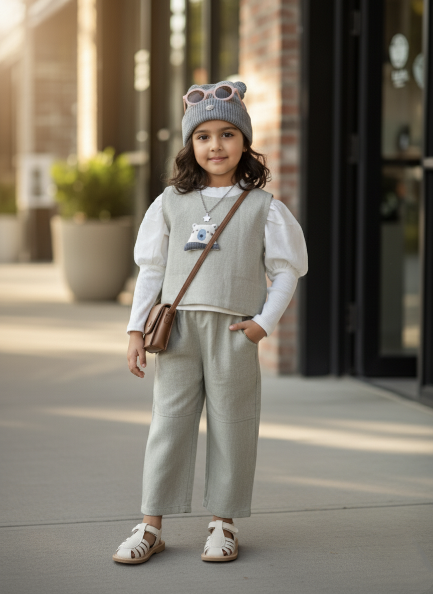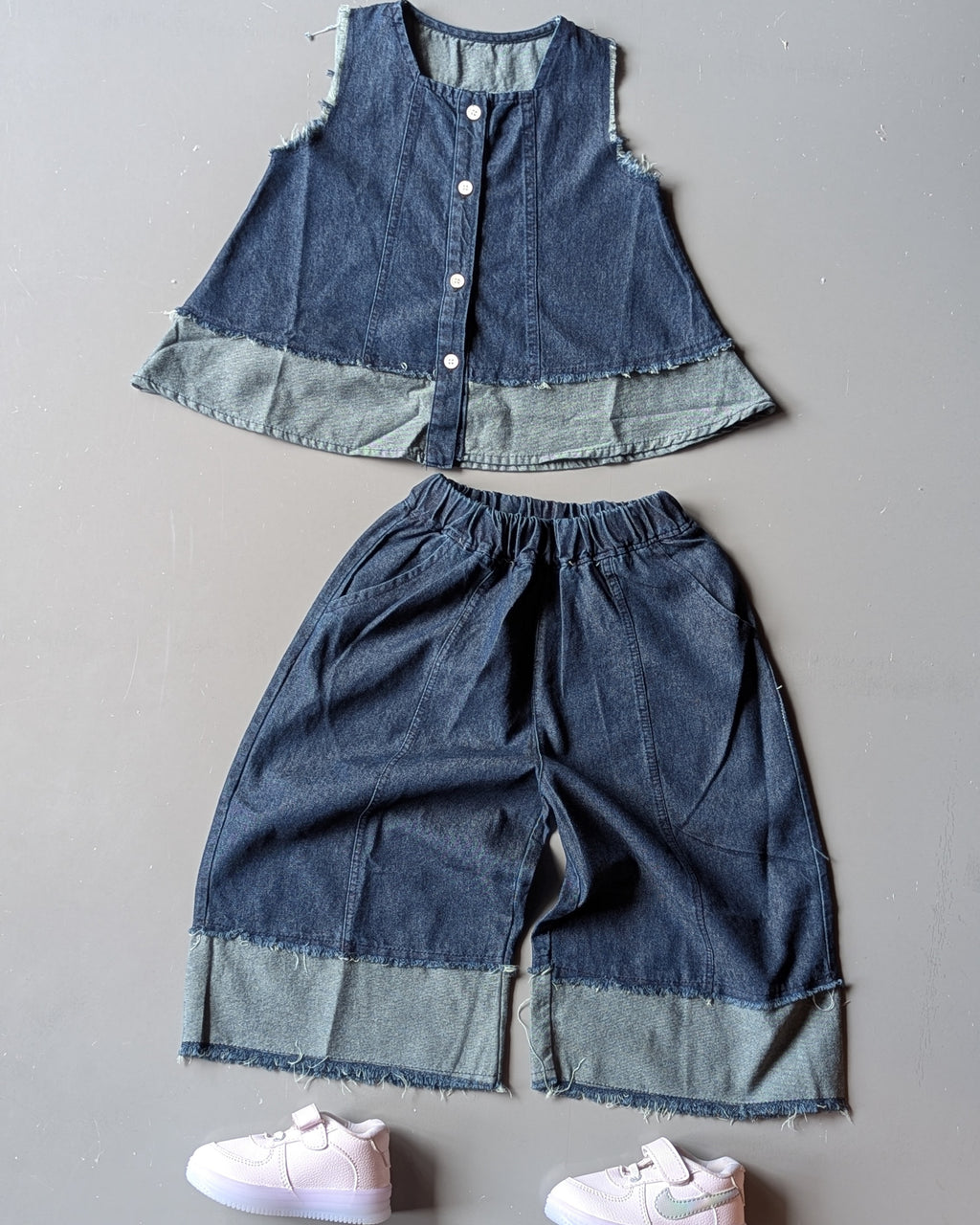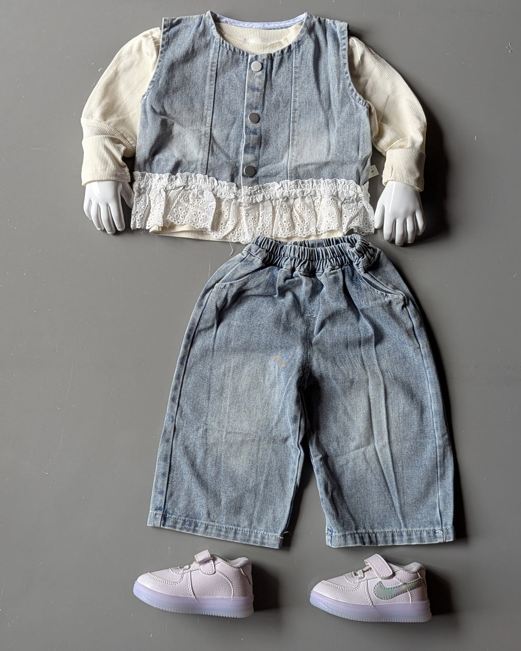 * Type: A two-piece set for a child, consisting of a long-sleeved top with a layered vest look, and matching denim pants.