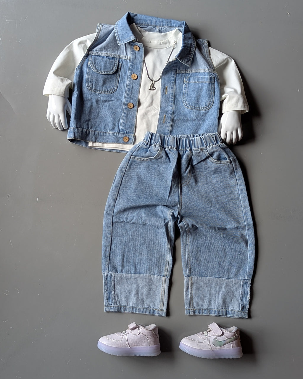 * Type: A three-piece casual ensemble for a child, featuring a long-sleeved white t-shirt, a denim vest, and matching denim pants. * Color Scheme: Predominantly light to medium wash blue denim, contrasted with a crisp white sh...