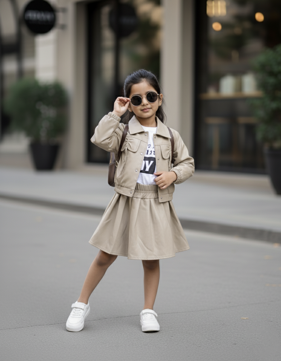 Trendy and stylish kidswear set featuring a light blue denim co-ord. The outfit includes a short-sleeve denim shirt with front pockets and yellow button accents, paired with a matching high-waist denim skirt featuring a fro...