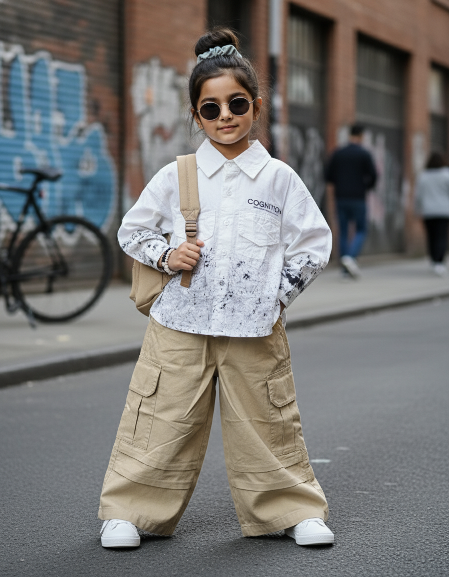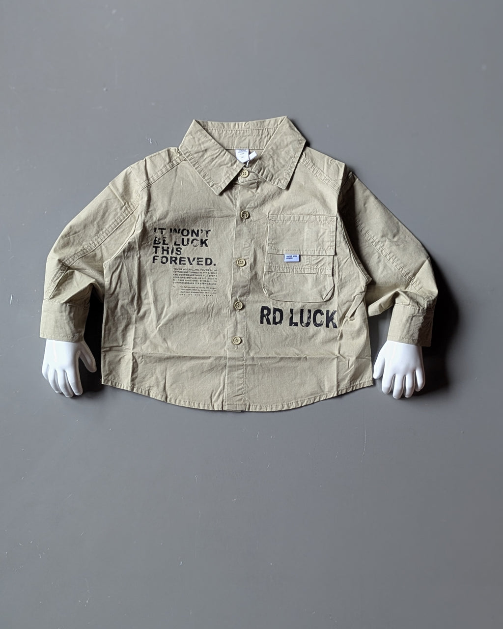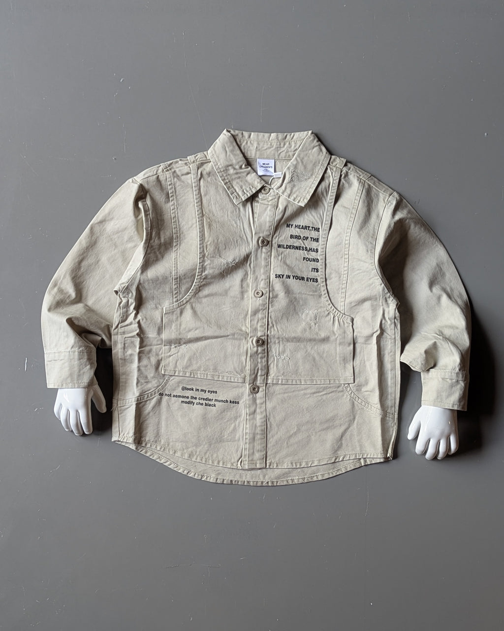 Type: Long-sleeved shirt with a collar. Color: beige-colored  Material: Looks like a lightweight cotton or similar fabric. Design Details (Front): Features black text graphics. On the right chest area, it reads, "MY HEART THE B...