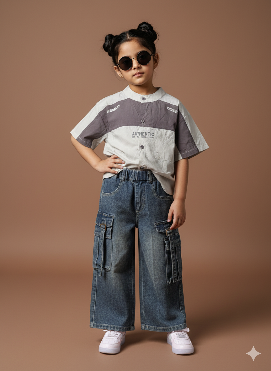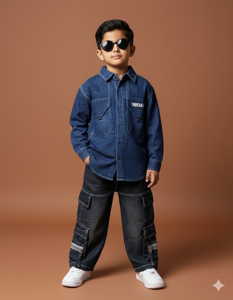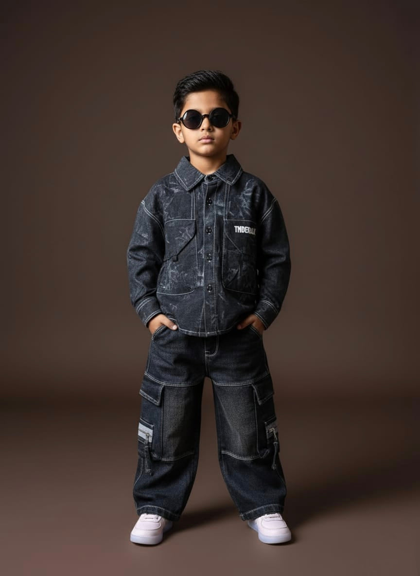 Shirt ​Type: Long-sleeved button-down shirt with a collar. ​Material: Appears to be a dark denim or a similar heavy cotton fabric. ​Color: Dark denim blue , with a washed-out or marbled pattern throughout. ​Design Details (Fro...