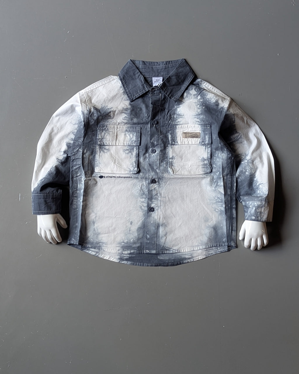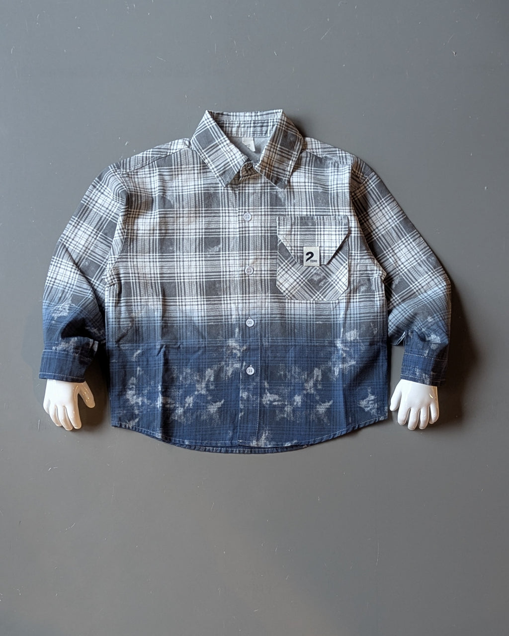Shirt Type: Long-sleeved, collared button-down shirt. Color: White with a prominent dark blue or gray tie-dye/dip-dye pattern. The color is concentrated around the collar, down the center of the shirt, and on the cuffs. Design ...