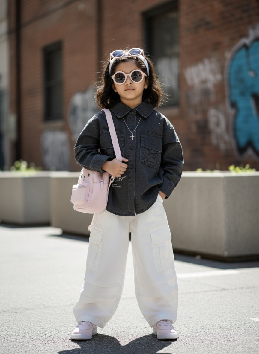 Shirt Type: Long-sleeved button-down shirt with a collar. Material: Appears to be a dark denim or a similar heavy cotton fabric. Color: Dark gray or black, with a washed-out or marbled pattern throughout. Design Details (Front)...
