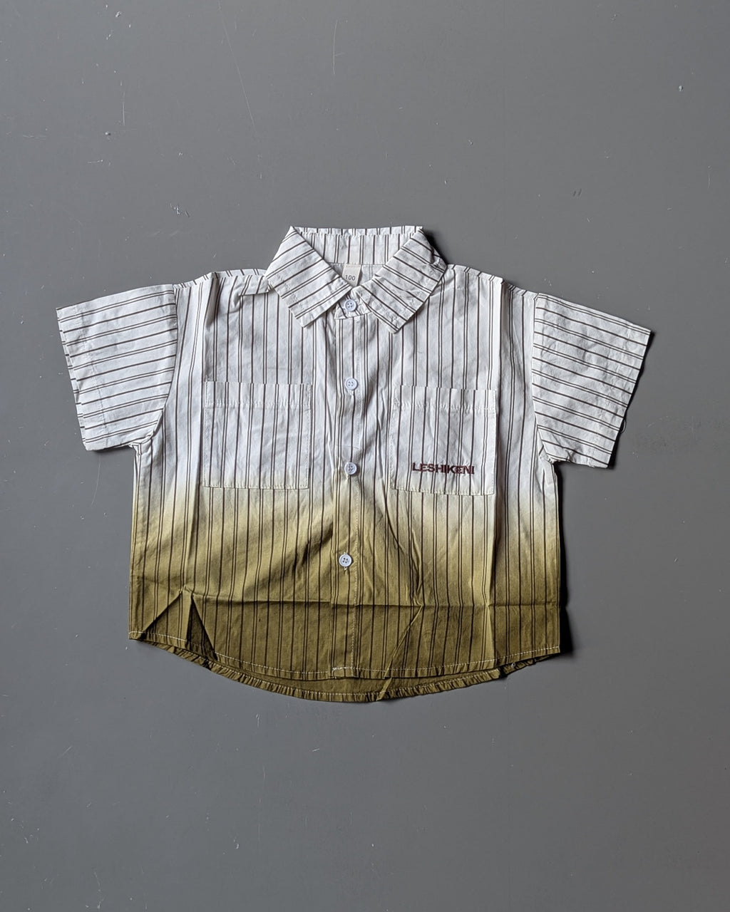 This is a children's short-sleeved, collared shirt. It features a vertical stripe pattern on the upper portion, which transitions into a solid, darker color (likely olive green or brown) towards the bottom in an ombre or dip-dy...