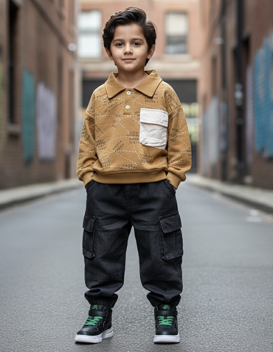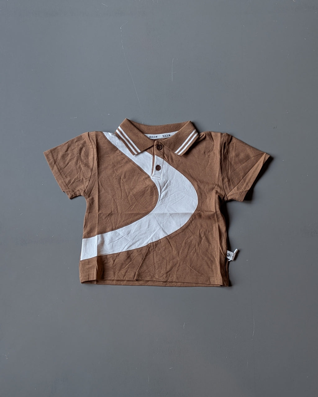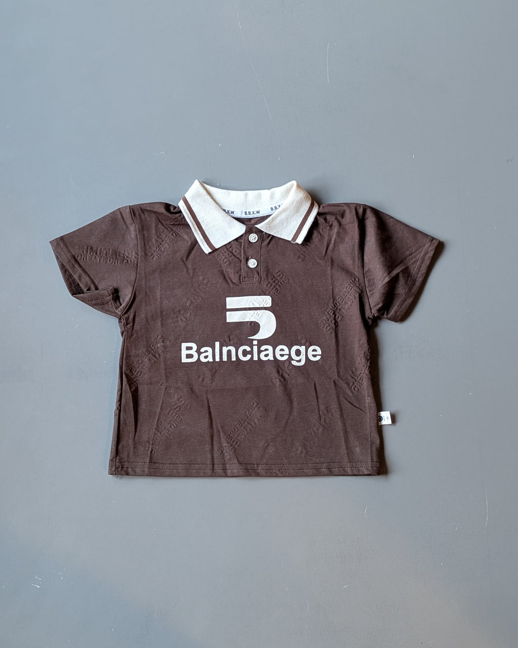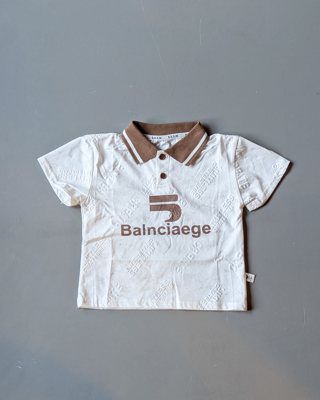 This is a kids' polo shirt featuring a white base with a brown collar and button placket. It has a bold brown graphic and the text "Balnciaege" on the front. The fabric also has embossed text patterns throughout, adding texture...