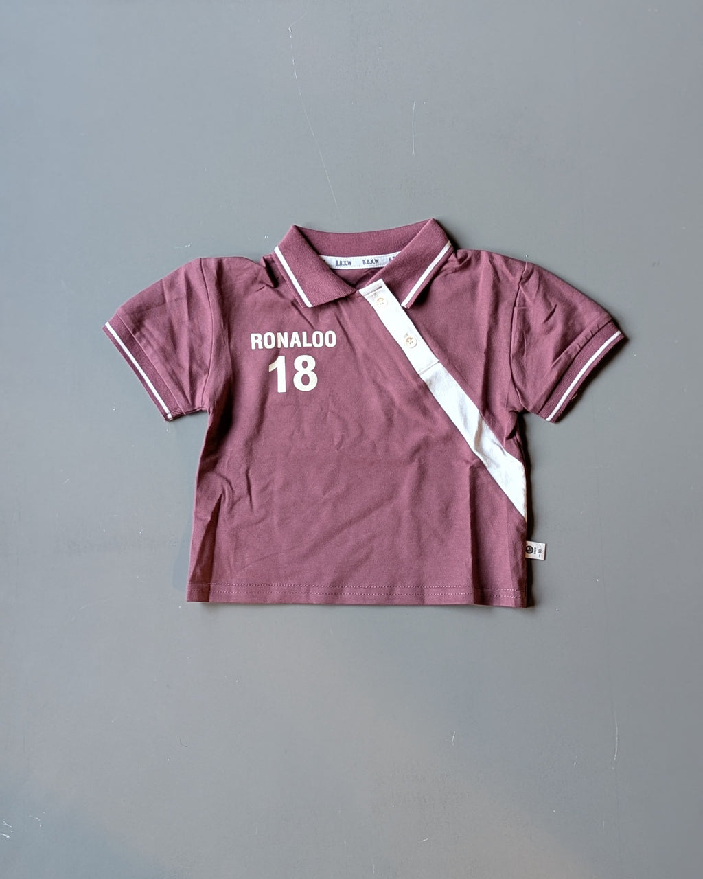 This is a kids' polo shirt with white detailing on the collar, sleeves, and a diagonal placket. It features the name "RONALOO" and the number "18" printed in white on the left chest, giving it a sporty, team-inspired look.