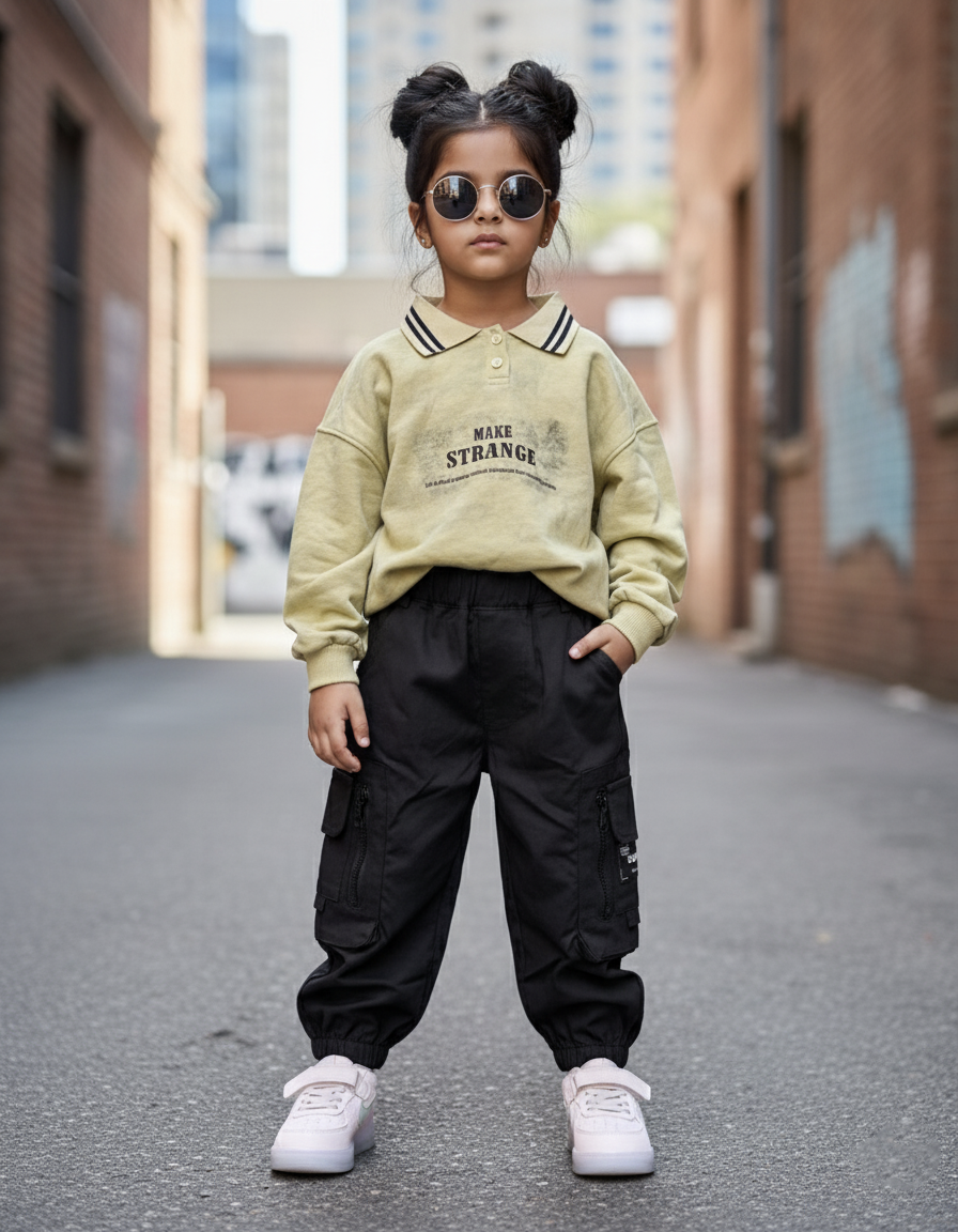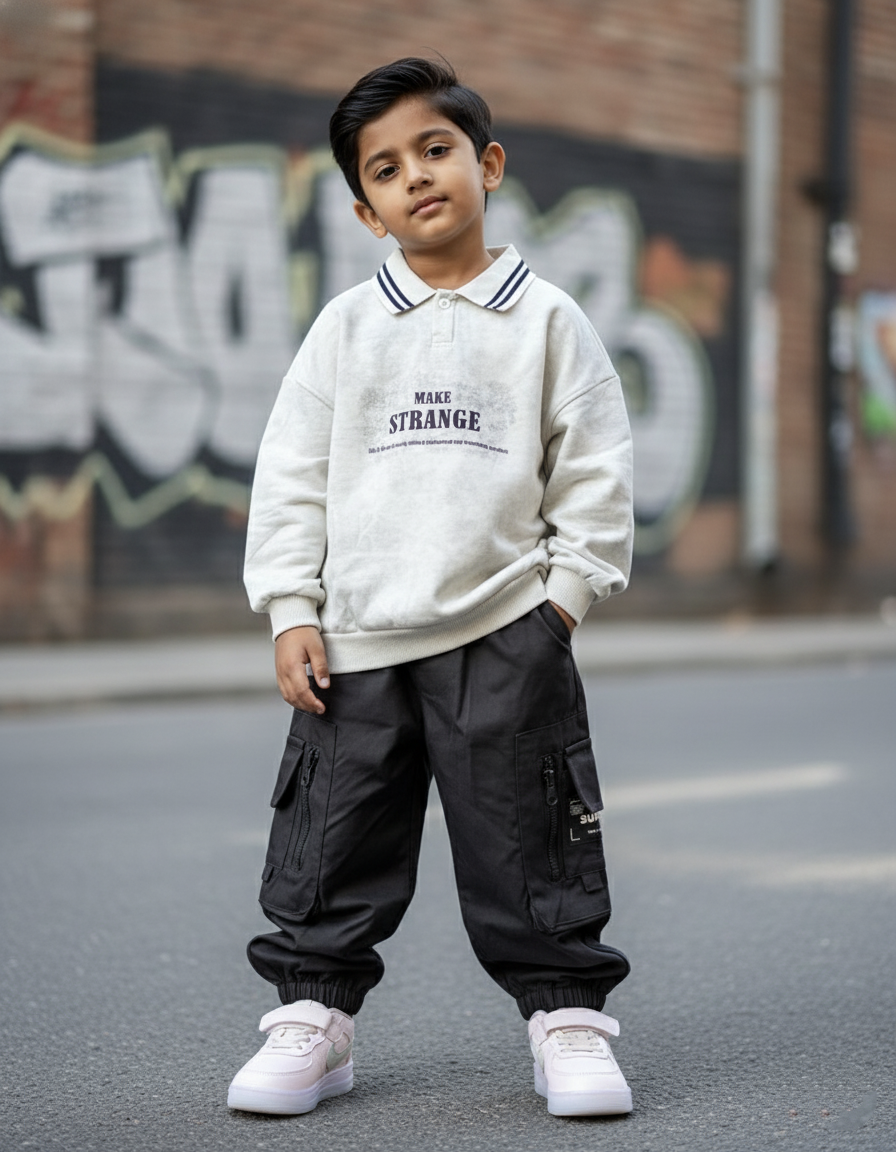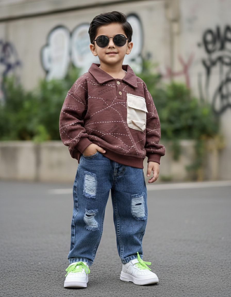 Style: It is a polo-style sweatshirt, featuring a collar and a short placket with likely one or two buttons (though the buttons are not clearly visible, the placket structure is).