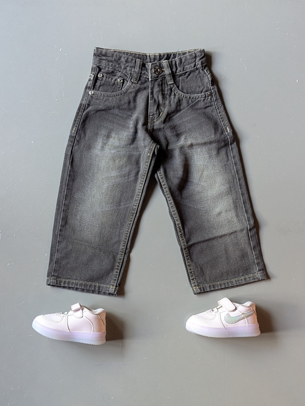Color: The jeans are a dark grey or black with a washed-out, faded effect, particularly on the thighs and knees.