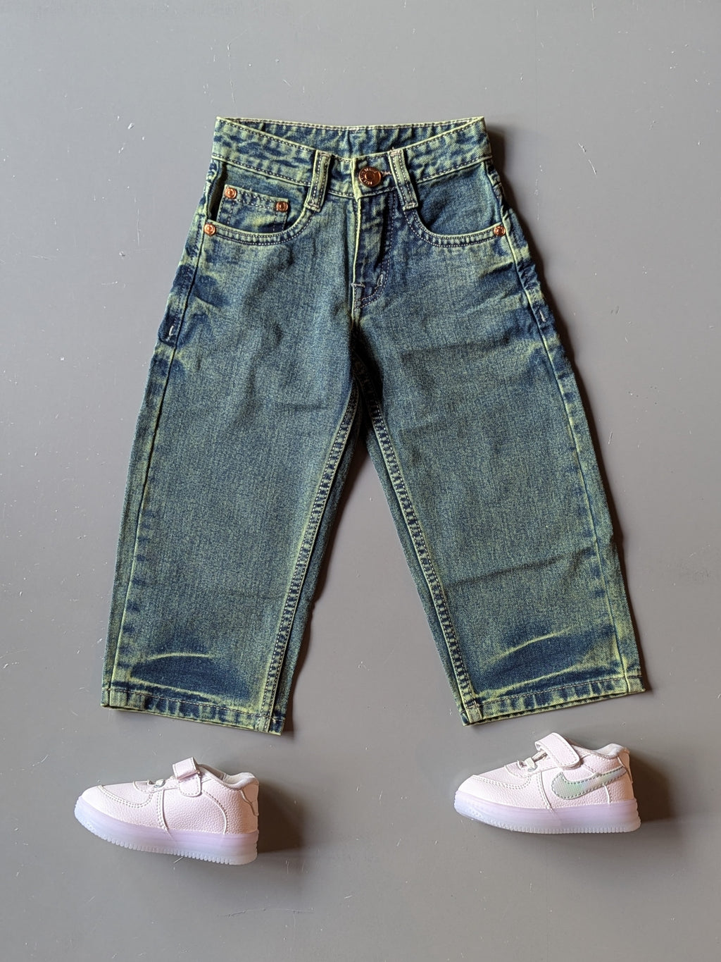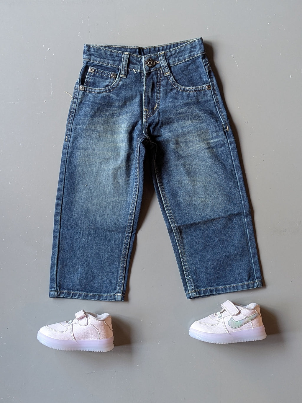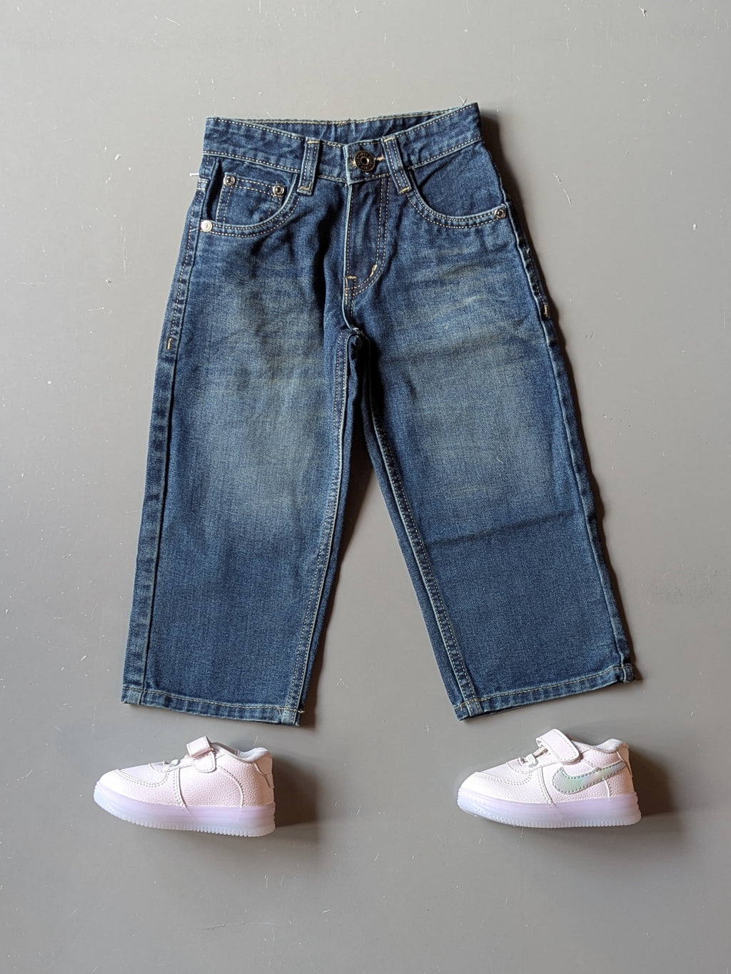 A pair of dark blue denim jeans: These appear to be for a child, with a classic straight-leg cut, pockets on the front and back, and a button and zipper closure. They have a slightly worn or faded look, particularly on the th...