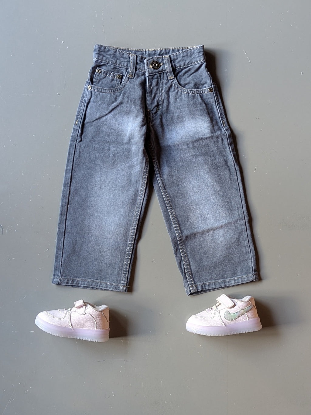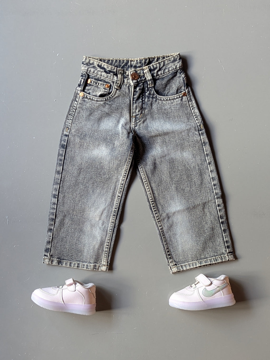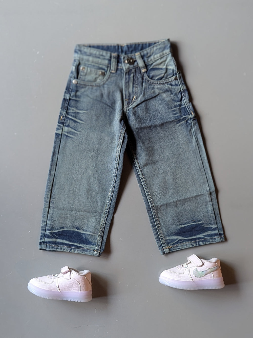 A pair of dark blue denim jeans: These appear to be for a child, with a classic straight-leg cut, pockets on the front and back, and a button and zipper closure. They have a slightly worn or faded look, particularly on the th...
