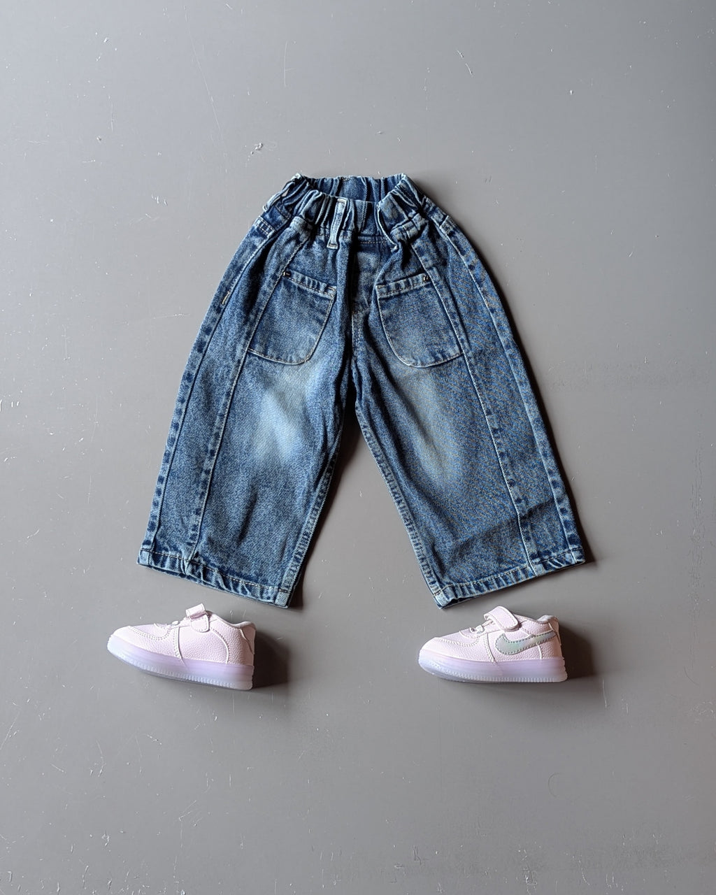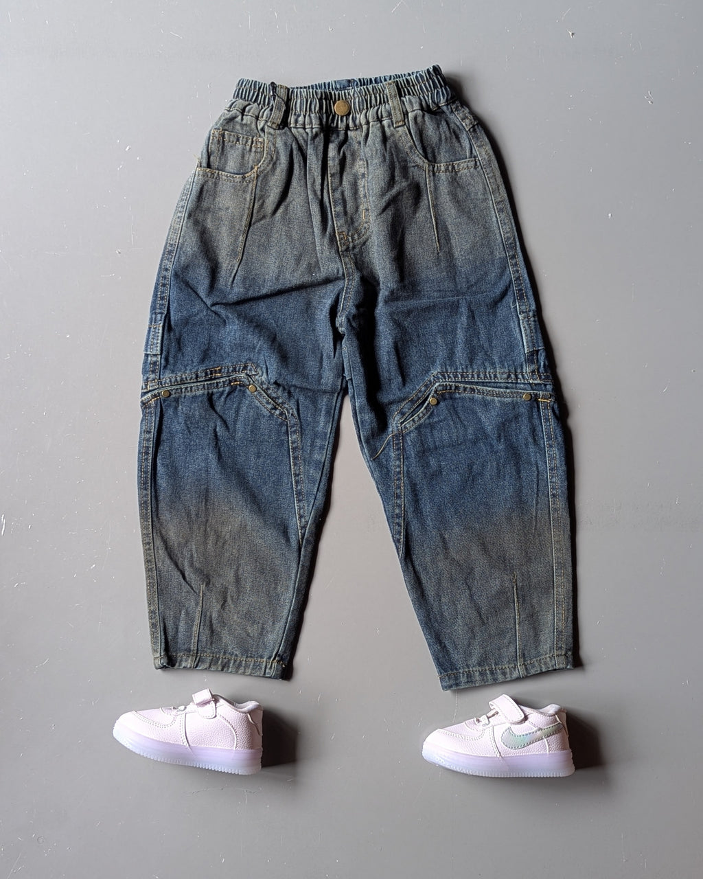 The clothing item is a pair of kid's denim pants in a medium-blue wash with a noticeable faded, worn-in appearance.