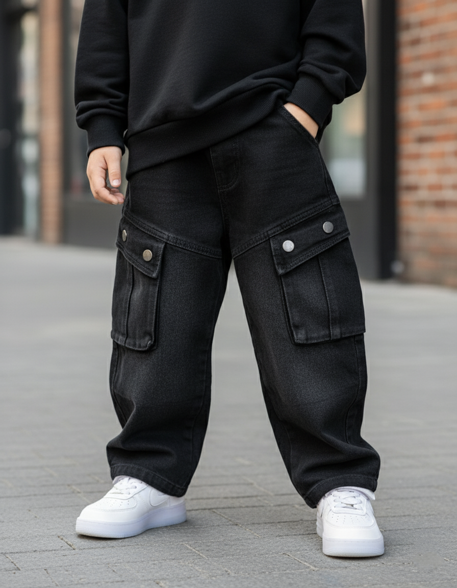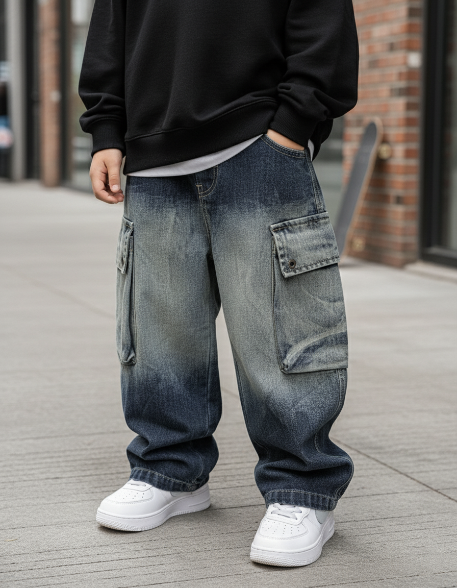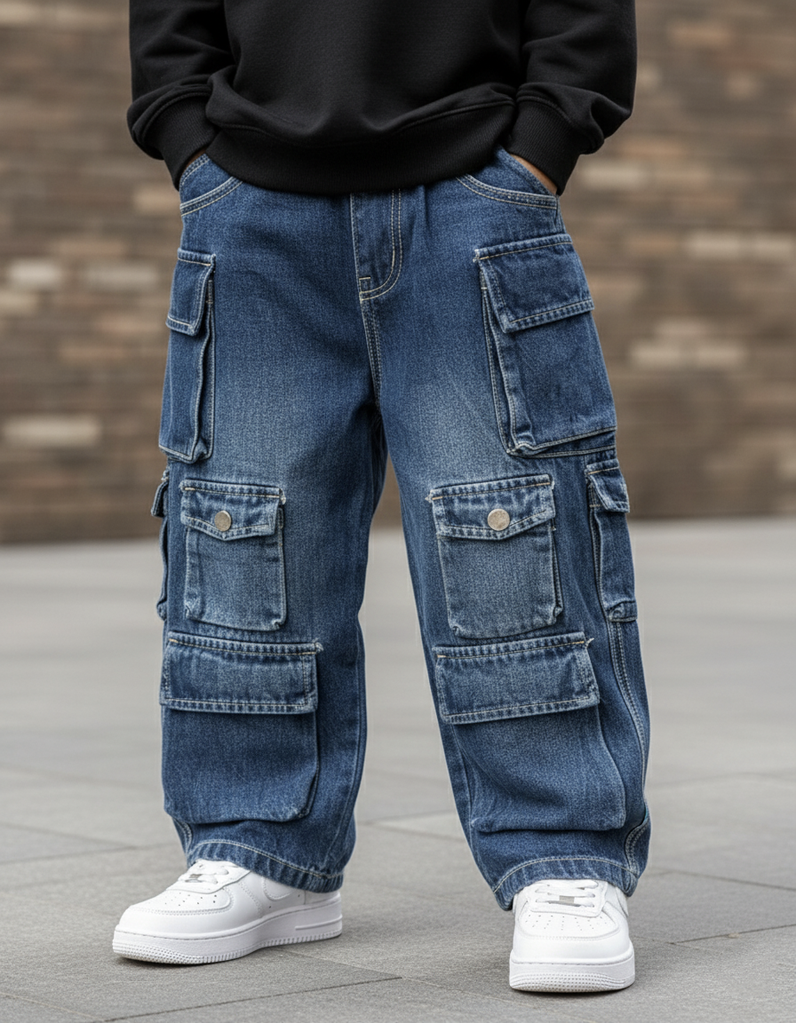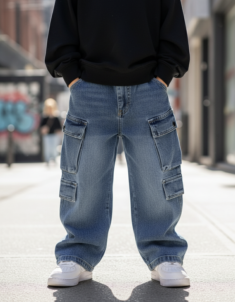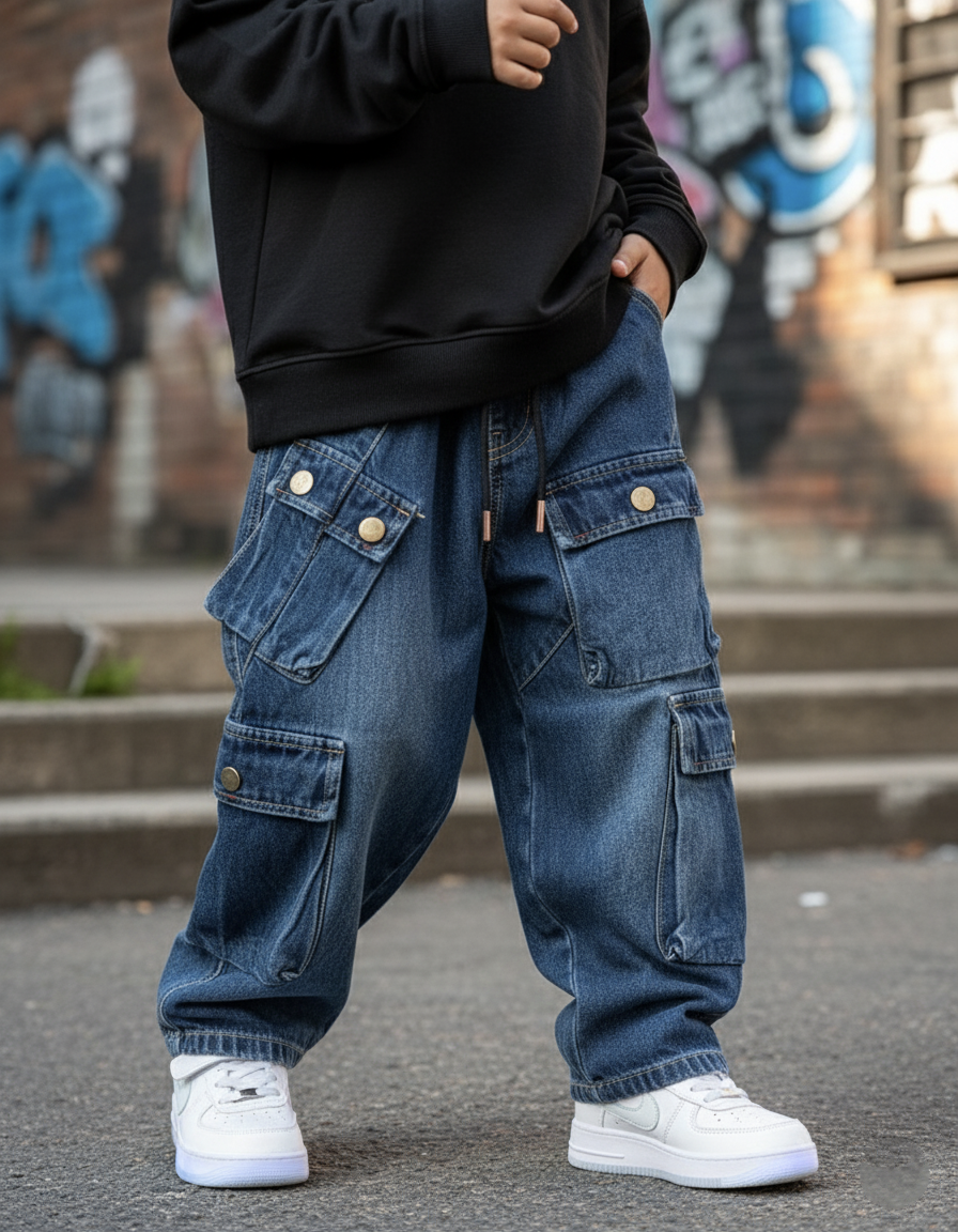 These pants are a popular style for kids, known for their utility and relaxed fit.