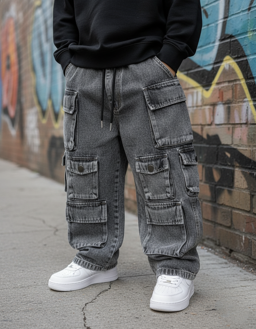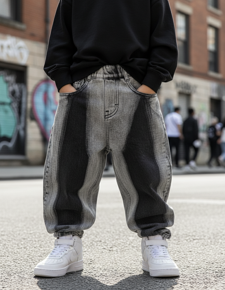 Style: They are jeans with a baggy/wide-leg fit, consistent with current streetwear trends. They also appear to have a cropped or slightly shorter length.