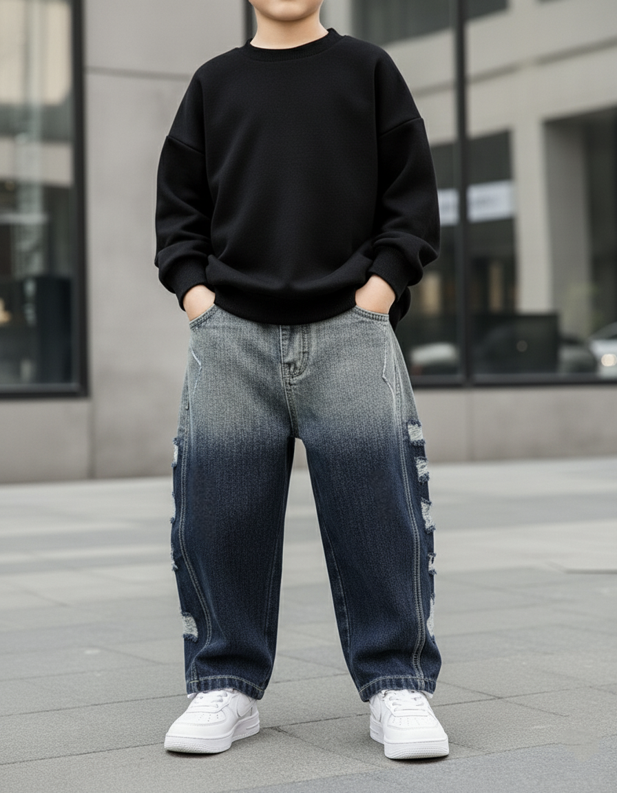 Pants: The blue pants are a baggy or wide-leg style, which is a popular trend in kids' fashion. They appear to be made of a denim or cotton-like material and feature an elasticated waistband for easy wear and a comfortable fi...