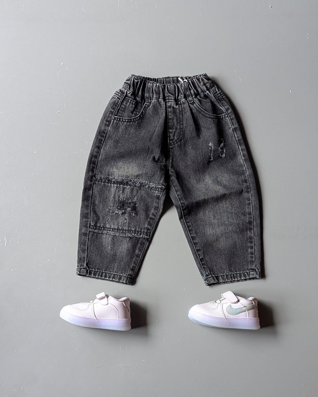 The clothing item is a pair of kid's distressed denim jeans with a faded black or charcoal grey wash.
